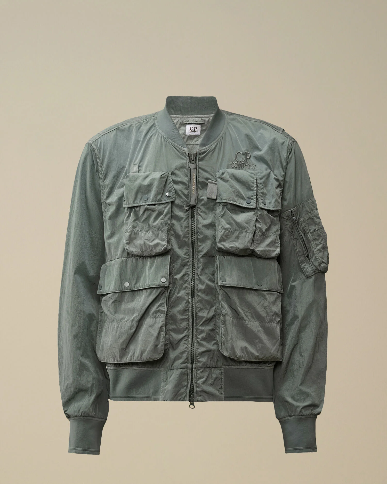 Bomber jacket crafted in Chrome-R, a 100% regenerated, shiny multifilament nylon. Made from production scraps reprocessed into a new fibre. Global Recycled Standard certified (GRS). Garment dyed anti-drop treated. Regular fit. - V-neck - Two-way full zip fastening - Chest embroidered logo detail - Flap snap pockets - Sleeve zip pocket - Elasticated cuffs and hem - Garment dyed - Regular fit CARE & COMPOSITION CARE - Wash max 30°C - Mild process - Do not bleach - Do not tumble dry - Ironing maximum temperature 110°C - without steam - Do not dry clean - Line dry - Wash inside out COMPOSITION - External fabric: 100% Polyamide / Nylon SIZE & FITTING - Fits true to size, take your normal size - Model is 186 cm-6' 1" / 98-103 cm chest and is wearing a size L
