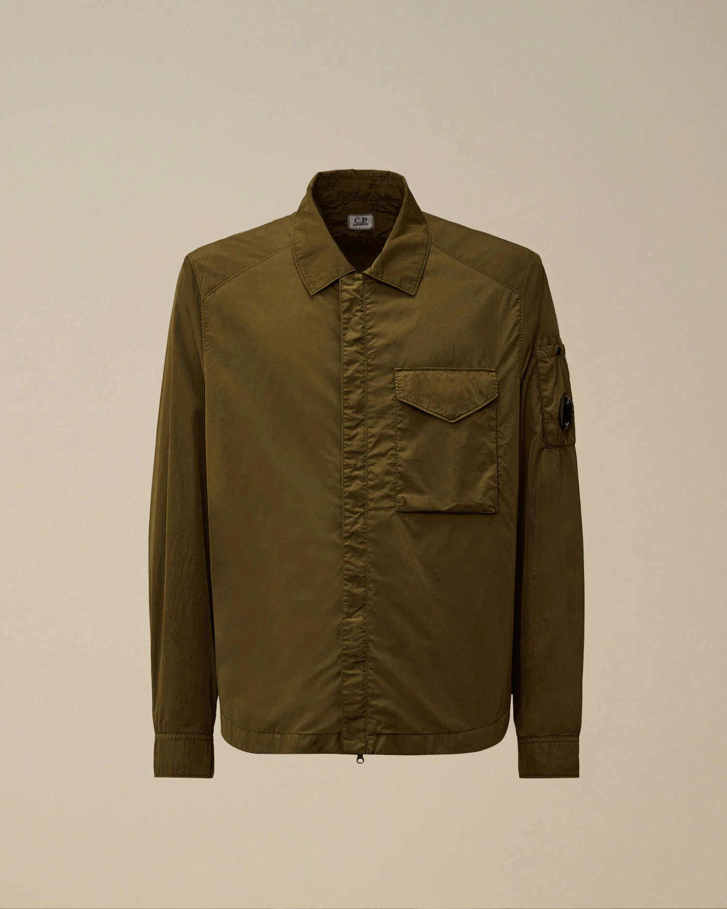 Overshirt crafted in Chrome-R, a 100% recycled, shiny multifilament nylon made from production scraps, reprocessed into a new fibre certified by the Global Recycled Standard (GRS). The overshirt features C.P. Company’s iconic Lens, a hidden two-way full zip fastening with flap snap closure, and a chest snap pocket. Finished with adjustable snap cuffs and a cotton twill lining. Garment dyed with anti-drop treatment. Regular fit. - Classic collar - Hidden two-way zip fastening with flap snap closure - Chest flap snap pocket - Lens detail - Adjustable snap cuffs - Garment dyed - Cotton Twill lining - Regular fit CARE & COMPOSITION Care - Wash max 30°C - Mild process - Do not bleach - Do not tumble dry - Ironing maximum temperature 110°C - without steam - Do not dry clean - Line dry - Wash inside out - Remove detachable accessories before washing Composition - External fabric: 100% Polyamide / Nylon - Lining: 100% Cotton - Secondary lining: 100% Polyamide / Nylon SIZE & FITTING - Fits true to size, take your normal size - Model is 186 cm-6' 1" / 98-103 cm chest and is wearing a size L PRODUCT PASSPORT PRODUCT - Weaving: China - Dyeing: China - Confection: China - Product contains at least 45% of recycled material - Releases plastic microfibers into the environment during washing PACKAGING - Minimum percentage of recycled materials 70%