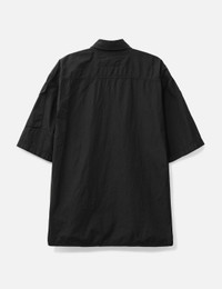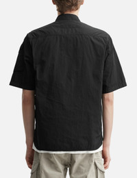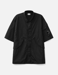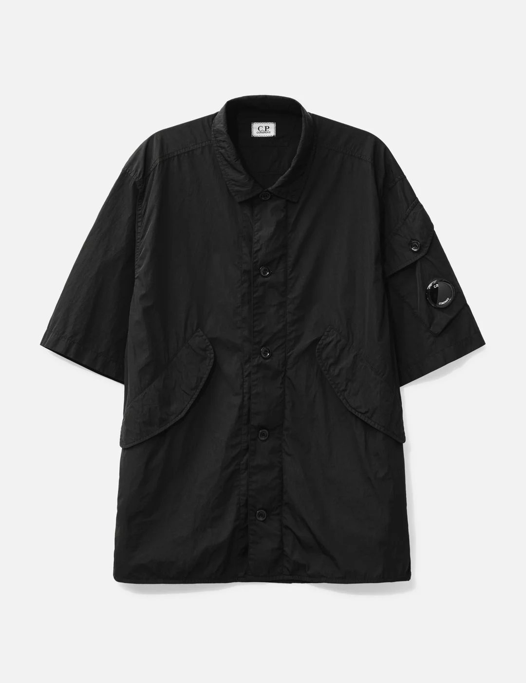 - C.P. Company - Chrome-R Short Sleeve Overshirt - 100% regenerated, shiny multifilament nylon fabric - Button closure - Two front pockets - One sleeve pocket with lens detail - Straight hem - Color: Black - Material: 100% Nylon - See more Shirts and Clothing SIZING - Model wears size L - Model measures: Height 188cm, Chest 38”/96cm, Waist 30”/78cm, Hip 37”/94cm