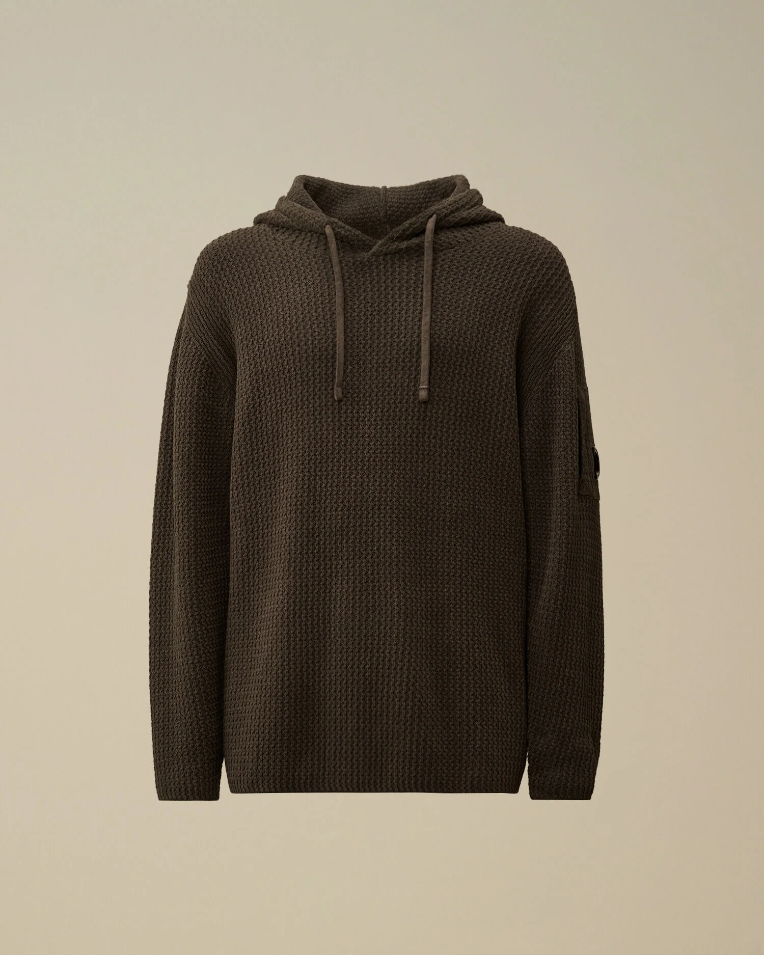 Hooded sweater crafted in cotton chenille. The knit features an adjustable hood and C.P. Company’s iconic Lens. Garment dyed. Gauge 5. Regular fit. - Adjustable hood - Lens detail-5 Gauge knit - Garment dyed - Regular fit CARE & COMPOSITION Care - Wash max 30°C - Mild process - Do not bleach - Do not tumble dry - Ironing maximum temperature 110°C - without steam - Do not dry clean - Flat dry in the shade - Wash separately - Wash inside out - Remove detachable accessories before washing Composition - External fabric: 100% Cotton SIZE & FITTING - Fits true to size, take your normal size - Model is 186 cm-6' 1" / 98-103 cm chest and is wearing a size L PRODUCT PASSPORT PRODUCT - Weaving: India - Dyeing: India - Confection: India PACKAGING - Minimum percentage of recycled materials 70%