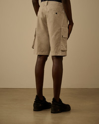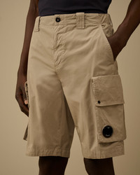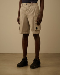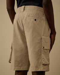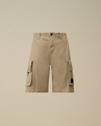 Cargo shorts crafted from cotton gabardine. The model features a button and zip fastening and belt loops. Completing the design are side pockets, cargo flap pockets with snap closures and the iconic C.P. Company Lens, and back welt pockets with snap closures and applied logo label. Garment dyed with the 'Old' treatment to achieve a distinctive, worn-in appearance and rich tonal depth. Regular fit. - Button and zip fastening - Belt loops - Side pockets - Cargo flap snap pockets with Lens detail - Back welt snap pockets with applied logo label - Old dyed - Regular fit CARE & COMPOSITION Care - Wash max 30°C - Mild process - Do not bleach - Do not tumble dry - Ironing maximum temperature 110°C - without steam - Do not dry clean - Line dry in the shade - Wash separately - Wash inside out - Iron inside out - Remove detachable accessories before washing Composition - External fabric: 100% Cotton SIZE & FITTING - Model is 186 cm-6' 1" and is wearing a size 48 - Fit: Regular PRODUCT PASSPORT PRODUCT - Weaving: Turkiye - Dyeing: Tunisia - Confection: Tunisia PACKAGING - Minimum percentage of recycled materials 70%