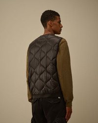 Padded gilet crafted in micro-ripstop opaque 7-denier quilted nylon. The lightness and transparency of the fabric emphasize the structure of the garment. The gilet features C.P. Company’s iconic Lens on the back, a full zip fastening with a button hem placket, and side snap pockets. Padded with Primaloft® Silver wadding, an insulation solution with high thermal and breathability properties. Regular fit. - V-neck - Full zip fastening with button hem placket - Side snap pockets - Lens detail on the back - Ribbed hem - Primaloft® Silver padding - Regular fit CARE & COMPOSITION Care - Wash max 30°C - Mild process - Do not bleach - Do not tumble dry - Ironing maximum temperature 110°C - without steam - Do not dry clean - Line dry - Wash separately - Remove detachable accessories before washing Composition - External fabric: 100% Polyamide / Nylon - Lining: 100% Polyamide / Nylon - Padding (Fiber): 100% Polyester - Secondary fabric: 100% Polyamide / Nylon - Secondary lining: 100% Polyamide / Nylon SIZE & FITTING - Fits true to size, take your normal size - Model is 186 cm-6' 1" / 98-103 cm chest and is wearing a size L PRODUCT PASSPORT PRODUCT - Weaving: Korea - Dyeing: Korea - Confection: China - Releases plastic microfibers into the environment during washing PACKAGING - Minimum percentage of recycled materials 70%