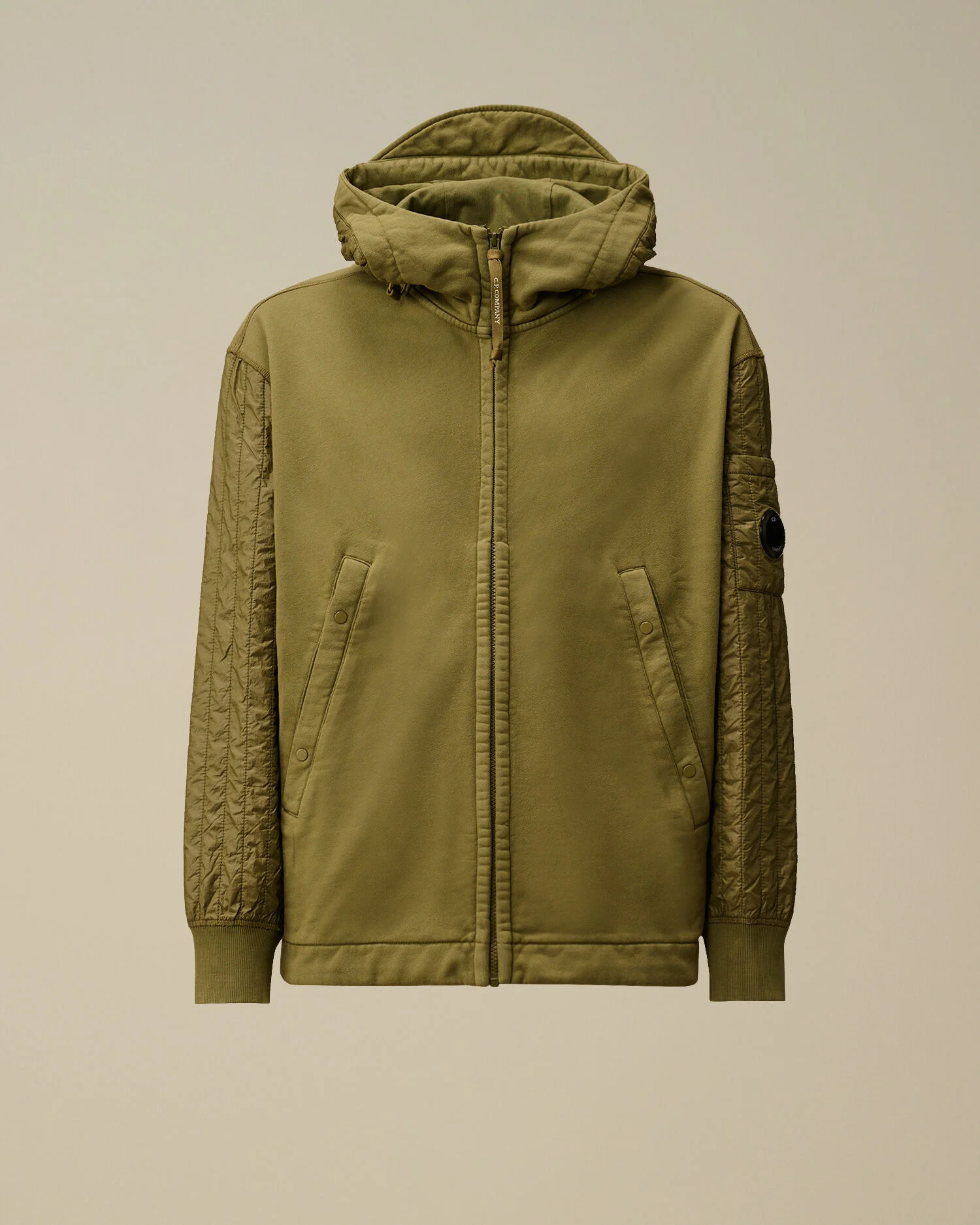 Full zip hooded sweatshirt crafted in gauzed diagonal-weave cotton, mixed with quilted nylon. The soft, brushed fabric offers comfort and ease of movement. The sweatshirt features an adjustable visor hood and sleeves in quilted padded nylon and C.P. Company’s iconic Lens. Finished with side snap pockets, ribbed cuffs, and an adjustable drawstring hem. Garment dyed. Regular fit. - Adjustable visor hood and sleeves in quilted padded nylon - Full zip fastening - Lens detail - Side snap pockets - Ribbed cuffs - Adjustable drawstring hem - Garment dyed - Regular fit CARE & COMPOSITION Care - Wash max 30°C - Do not bleach - Do not tumble dry - Ironing maximum temperature 110°C - without steam - Do not dry clean - Line dry - Wash with similar colours - Wash inside out - Do not iron decorations - Do not expose to heat - vaporizing allowed only - Remove detachable accessories before washing - Dry inside out - Do not expose the garment to direct sunlight or artificial light Composition - External fabric: 100% Cotton - Padding (Fiber): 100% Polyester - Secondary fabric: 100% Polyamide / Nylon SIZE & FITTING - Fits true to size, take your normal size - Model is 186 cm-6' 1" / 98-103 cm chest and is wearing a size L PRODUCT PASSPORT PRODUCT - Weaving: China - Dyeing: China - Confection: China - Product contains at least 15% of recycled material PACKAGING - Minimum percentage of recycled materials 70%