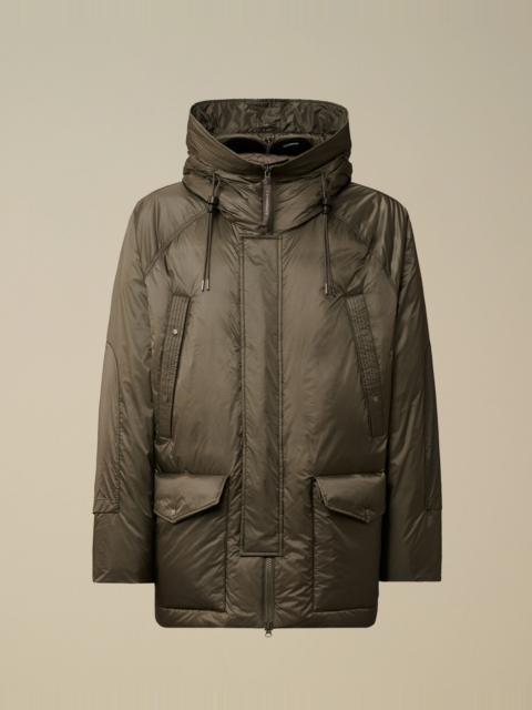 Goggle jacket crafted in Down Shield, a laminated 15-denier rip-stop nylon. The jacket features C.P. Company’s iconic Goggle hood with back straps, a hidden full zip fastening with flap snap closure, and chest snap pockets. Complete with front patch flap snap pockets and elbow patches. Bonded for a water column of 5000mm. Regular fit. - Adjustable Goggle hood with back straps - Hidden full zip fastening with flap snap closure - Chest snap pockets - Front patch flap snap pockets - Elbow patches - Regular fit CARE & COMPOSITION Care - Wash max 30°C - Mild process - Do not bleach - Do not tumble dry - Ironing maximum temperature 110°C - without steam - Do not dry clean - Line dry - Wash inside out - Remove detachable accessories before washing Composition - External fabric: 100% Polyamide / Nylon - Lining: 100% Cotton - Padding (Fiber): 100% Polyester - Coating: 100% Polyurethanic resin - Secondary lining: 100% Polyamide / Nylon - Padding (Feather): [168gr. - 95% ] 95% White duck down, 5% Feather SIZE & FITTING - Fits true to size, take your normal size - Model is 186 cm-6' 1" / 98-103 cm chest and is wearing a size L PRODUCT PASSPORT PRODUCT - Weaving: Korea - Dyeing: Korea - Confection: China - Product contains at least 20% of recycled material - Releases plastic microfibers into the environment during washing PACKAGING - Minimum percentage of recycled materials 70%