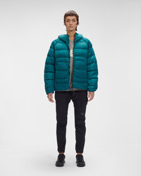 A medium down jacket featuring a padded body, Goggle hood, full zip fastening and secure front pockets. Chrome is C.P. Company’s foundation woven multifilament nylon. This new version uses Econyl® regenerated nylon yarns, created through the upcycling of fishing nets. - Regenerated nylon - Full Zip Fastening - Secure Front Pockets CARE & COMPOSITION CARE - Wash max 30°C - Mild process - Do not bleach - Tumble drying at lower temperature - Ironing maximum temperature 110°C - without steam - Do not dry clean - Line dry - Wash separately - Wash inside out - Remove detachable accessories before washing COMPOSITION - External fabric: 100% Polyamide / Nylon - Lining: 100% Polyamide / Nylon - Padding (Feather): [132gr. - 0% ] 90% Grey duck down, 10% Grey Duck feather SIZE & FITTING - Fits true to size, take your normal size - Model is 186 cm-6' 1" / 98-102 cm chest and is wearing a size 50 - Female model is 176 cm - 5' 11" and is wearing a size 46