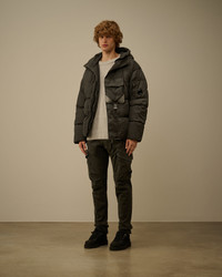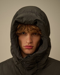 Hooded down jacket crafted in Eco-Chrome R Mixed, the evolution of Chrome-R using ECONYL®, a 100% regenerated nylon. The jacket features C.P. Company’s iconic Lens, a hidden two-way full zip fastening with a flap snap closure, and chest and side snap pockets. Mixed with Twill nylon taslan. Garment dyed with anti-drop treatment. Regular fit. - Adjustable hood - Hidden two-way full zip fastening with flap snap closure - Chest flap snap pocket - Side snap pockets - Lens detail - Ribbed cuffs - Adjustable drawstring hem - Garment dyed - Mixed with twill nylon taslan - Regular fit CARE & COMPOSITION Care - Wash max 30°C - Mild process - Do not bleach - Do not tumble dry - Ironing maximum temperature 110°C - without steam - Do not dry clean - Line dry - Wash separately - Reshape when damp - Remove detachable accessories before washing Composition - External fabric: 100% Polyamide / Nylon - Lining: 100% Polyamide / Nylon - Secondary fabric: 100% Polyamide / Nylon - Padding (Feather): [256gr. - 90% ] 90% Grey duck down, 10% Duck feather SIZE & FITTING - Fits true to size, take your normal size - Model is 186 cm-6' 1" / 98-103 cm chest and is wearing a size L PRODUCT PASSPORT PRODUCT - Weaving: Italy - Dyeing: Italy - Confection: Bulgaria - Product contains at least 40% of recycled material - Releases plastic microfibers into the environment during washing PACKAGING - Minimum percentage of recycled materials 70%
