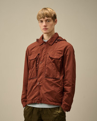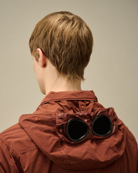 Goggle overshirt crafted in Flatt Nylon, an emerized opaque nylon with light resin on the reverse side. Detachable Goggle hood. Garment dyed anti-drop treated. Regular fit. - Adjustable detachable Goggle hood - Hidden two-way zip fastening with button closure - Chest embroidered logo detail - Chest flap snap pockets with side opening - Side flap snap pockets - Adjustable button cuffs - Button placket on hem - Contrast details - Adjustable drawstring hem - Garment dyed - Regular fit CARE & COMPOSITION CARE - Wash max 30°C - Mild process - Do not bleach - Do not tumble dry - Ironing maximum temperature 110°C - without steam - Do not dry clean - Line dry - Wash separately - Wash inside out - Do not iron decorations - Remove detachable accessories before washing COMPOSITION - External fabric: 100% Polyamide / Nylon - Lining: 100% Polyamide / Nylon - Coating: 100% Polyurethanic resin - Secondary fabric: 100% Polyamide / Nylon SIZE & FITTING - Fits true to size, take your normal size - Model is 186 cm-6' 1" / 98-103 cm chest and is wearing a size L
