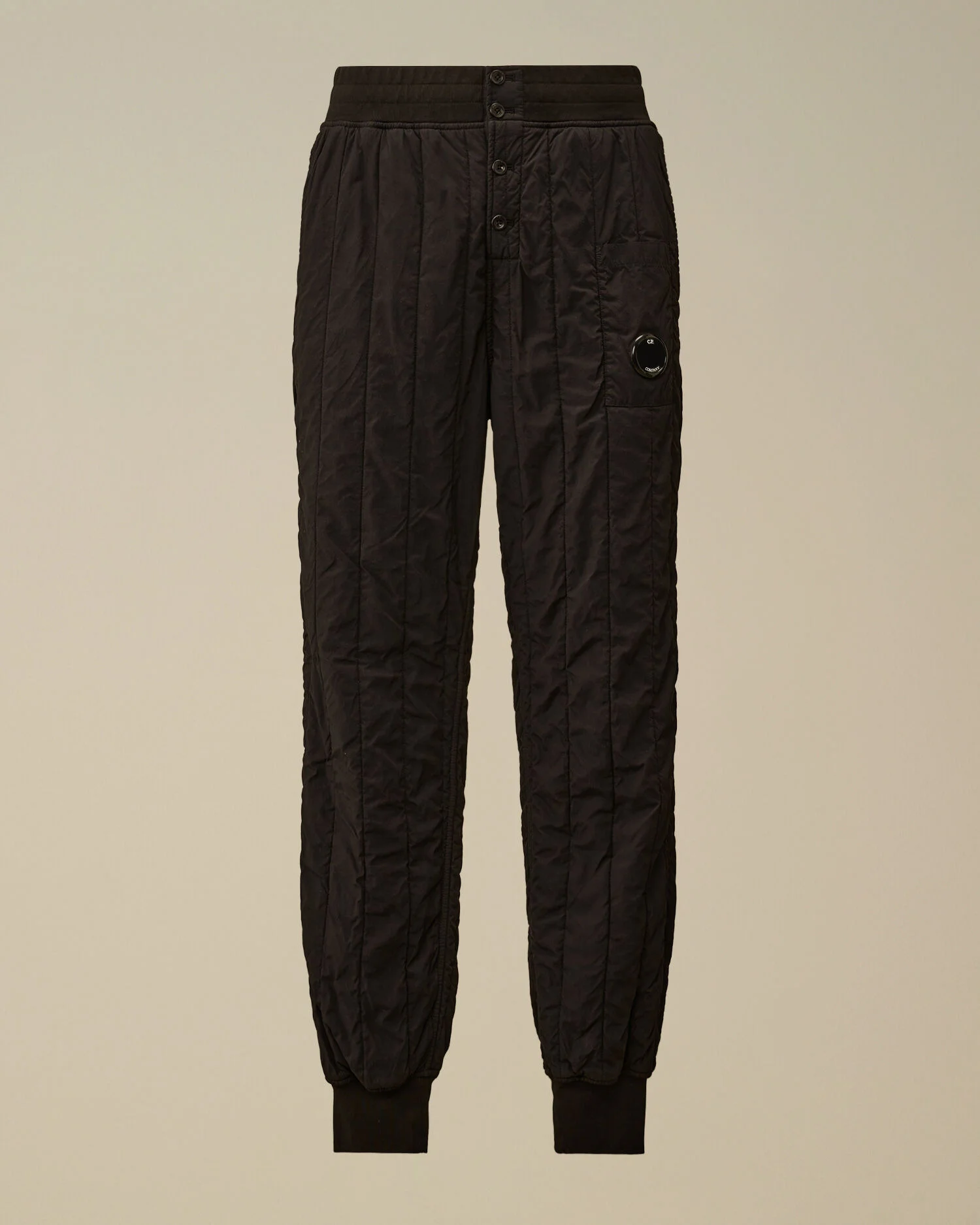 Padded sweatpants crafted in the garment dyed version of twill fabric from the Liner family. The pants feature C.P. Company’s iconic Lens, an adjustable drawstring waistband with button fastening, and side pockets. Finished with a back button pocket and ribbed hems. Wadding padded. Regular fit. - Adjustable drawstring waistband with button fastening - Lens detail - Side pockets - Back button pocket - Ribbed hems - Garment dyed - Wadding padded - Regular fit CARE & COMPOSITION Care - Wash max 30°C - Mild process - Do not bleach - Do not tumble dry - Ironing maximum temperature 110°C - without steam - Do not dry clean - Line dry - Wash separately - Do not soak - Remove detachable accessories before washing Composition - External fabric: 100% Polyamide / Nylon - Lining: 100% Polyamide / Nylon - Padding (Fiber): 100% Polyester SIZE & FITTING - Fits true to size, take your normal size - Model is 186 cm-6' 1"/ 88-91 cm waist and is wearing a size 48 PRODUCT PASSPORT PRODUCT - Weaving: China - Dyeing: China - Confection: China - Releases plastic microfibers into the environment during washing PACKAGING - Minimum percentage of recycled materials 70%