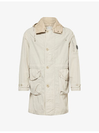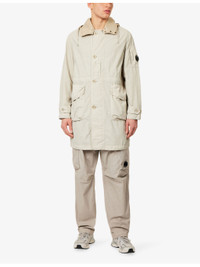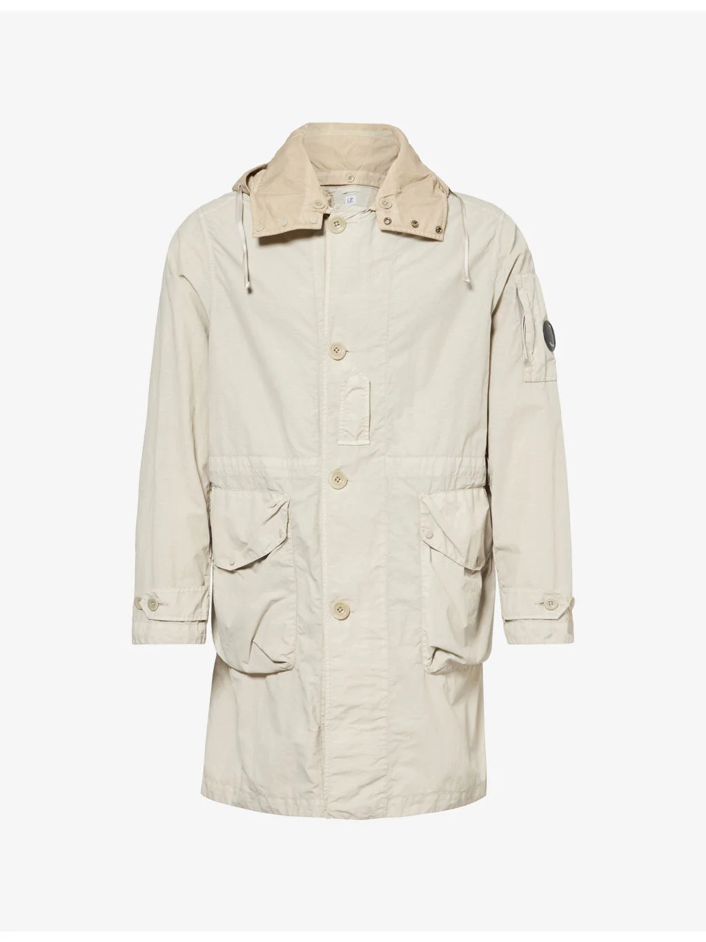 PRODUCT DETAILS - C.P. Company woven jacket - 100% polyamide; contrast 100% polyamide; lining 100% polyamide - Exposed button fastening at front - Regular fit, high-neck, contrast detachable drawstring hood, long sleeves, zip pocket at sleeve, buttoned epaulette at cuffs, branded lenses at hood and sleeve, two buttoned pockets at front, drawstring waist, partially lined - Machine wash at 30°C - Size medium: length 35in / 90cm, chest 46in / 117cm - Model is 6ft 2in/1.88m and wears a size medium - Lightweight, non-stretch Ref: R04562749