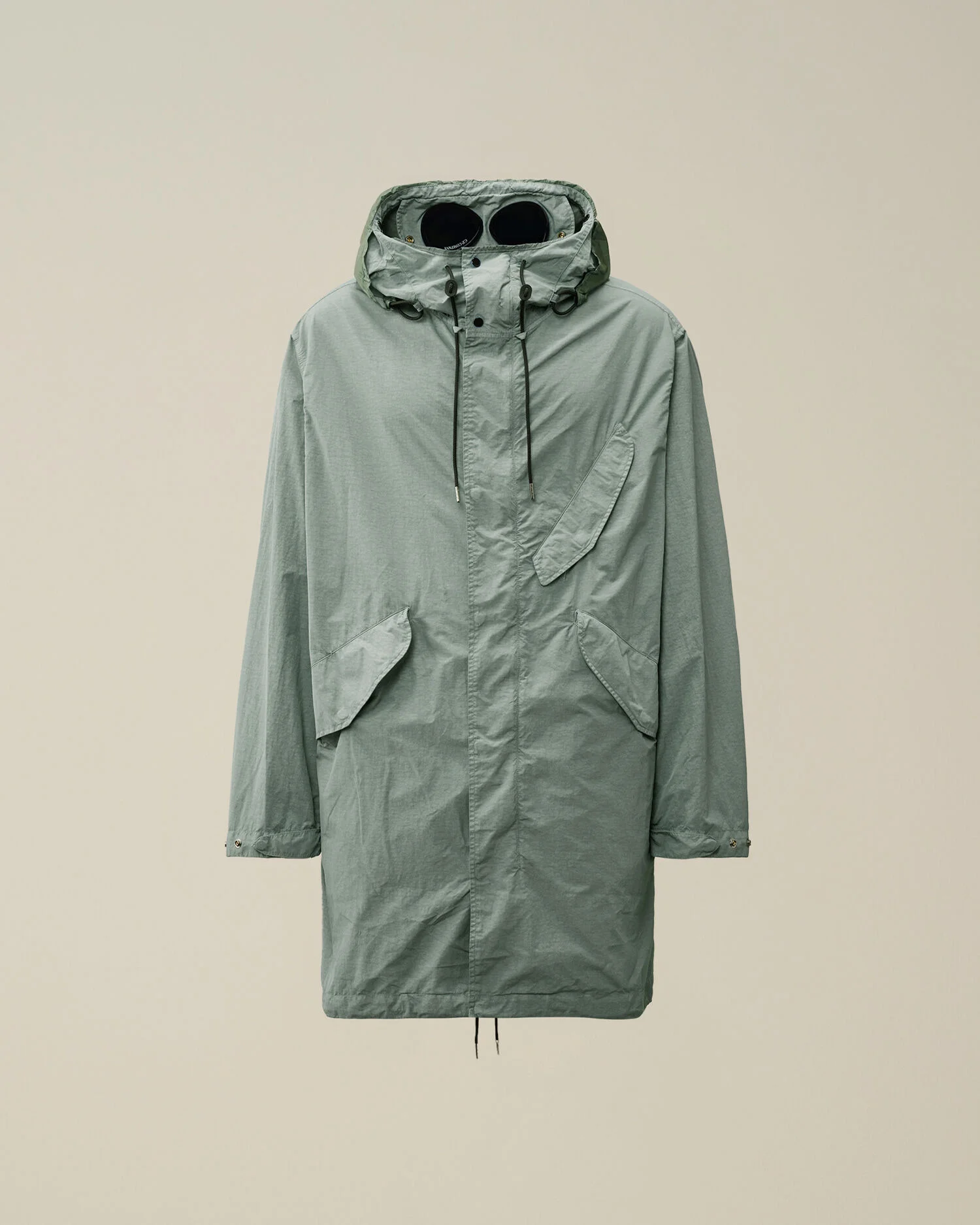 Goggle fishtail parka crafted in Flatt Nylon, an emerized opaque nylon with light resin on the reverse side. Garment dyed anti-drop treated. Pockets in 100% recycled nylon, Global Recycled Standard certified (GRS). External CS II hood. Regular fit. - Adjustable Goggle hood - External CS II hood - Hidden two-way zip fastening with flap snap closure - Flap snap pockets - Fishtail hem on the back - Adjustable flap snap cuffs - Garment dyed - Regular fit CARE & COMPOSITION CARE - Wash max 30°C - Mild process - Do not bleach - Do not tumble dry - Ironing maximum temperature 110°C - without steam - Do not dry clean - Line dry - Wash separately - Wash inside out - Remove detachable accessories before washing COMPOSITION - External fabric: 100% Polyamide / Nylon - Lining: 100% Polyamide / Nylon - Coating: 100% Polyurethanic resin - Secondary fabric: 100% Polyamide / Nylon SIZE & FITTING - Fits true to size, take your normal size - Model is 186 cm-6' 1" / 98-103 cm chest and is wearing a size L