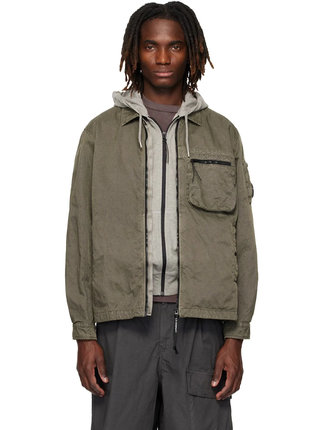 Nylon canvas overshirt. · Pigment-dyed · Spread collar · Two-way zip closure · Zip pocket at chest · Welt pockets at front · Patch pocket and logo-printed lens at sleeve · Adjustable buttoned barrel cuffs Supplier color: Moss gray 100% polyamide. Made in Bulgaria 261357M180026