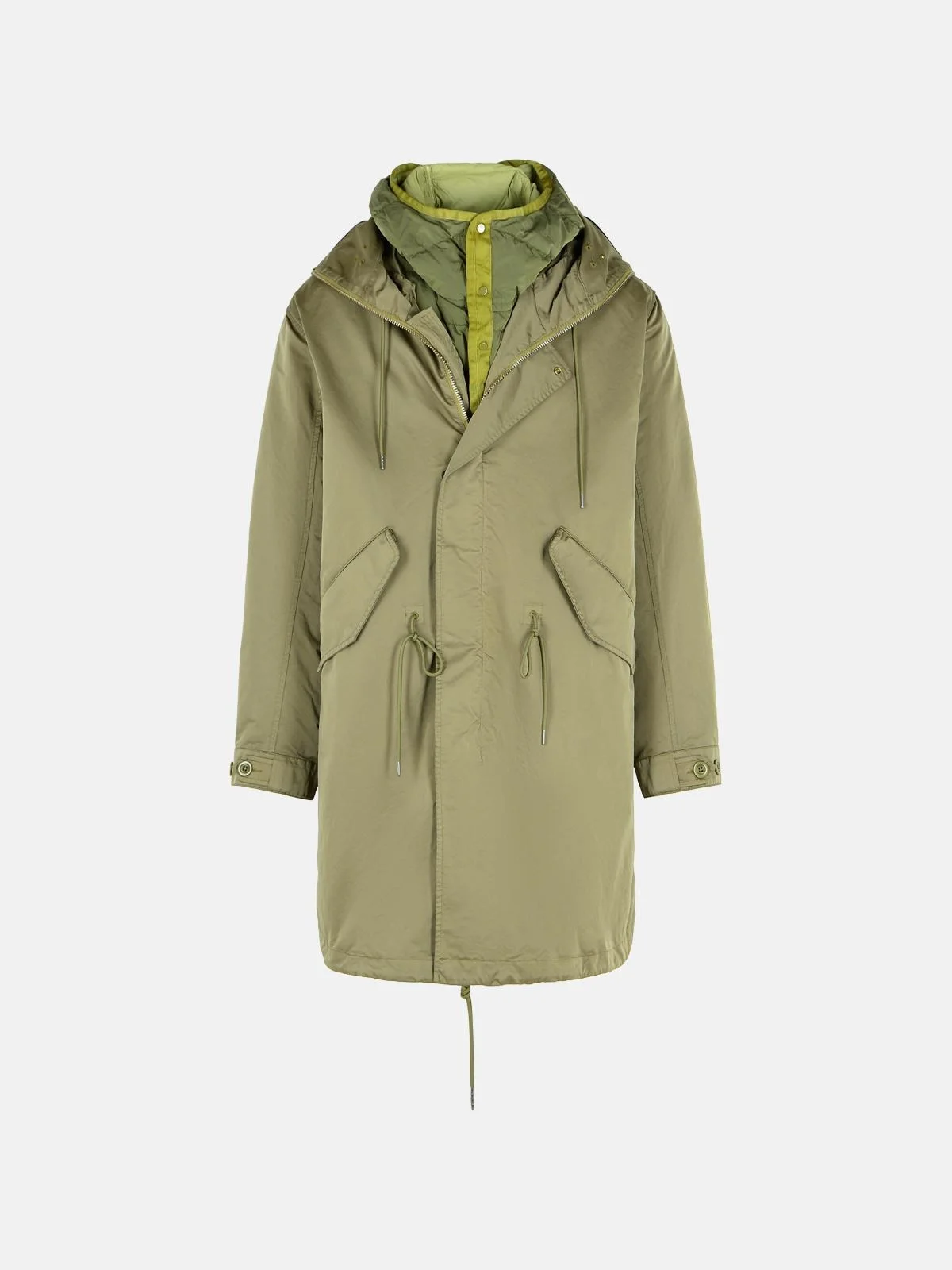 Manufacture code: 19CMOW190A 110089G 652 Retail code: 19CMOW190A 110089G 652 Removable inner down jacket with hood and buttons, hood with 'Lens' applique and external drawstring, full-height zip and front button closure, side pockets with flap and button, external drawstring on the waist, button cuffs, inner pouch pocket, straight hem with drawstring Main: 66% polyester, 34% nylon Made in China