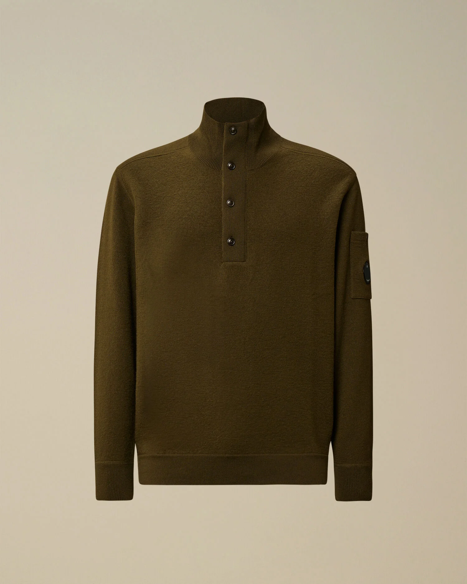 Half button sweater crafted in merino wool with a felted finish. The knit features a ribbed collar, C.P. Company’s iconic Lens, and ribbed cuffs. Gauge 12. Regular fit. - Ribbed collar - Half button fastening - Lens detail - Ribbed cuffs - 12 Gauge knit - Regular fit CARE & COMPOSITION Care - Do not wash - Do not bleach - Do not tumble dry - Ironing maximum temperature 110°C - without steam - Dry cleaning in tetrachloroethene - mild process - Do not soak - Remove detachable accessories before washing Composition - External fabric: 55% Wool, 45% Cotton SIZE & FITTING - Fits true to size, take your normal size - Model is 186 cm-6' 1" / 98-103 cm chest and is wearing a size L PRODUCT PASSPORT PRODUCT - Weaving: India - Dyeing: India - Confection: India PACKAGING - Minimum percentage of recycled materials 70%