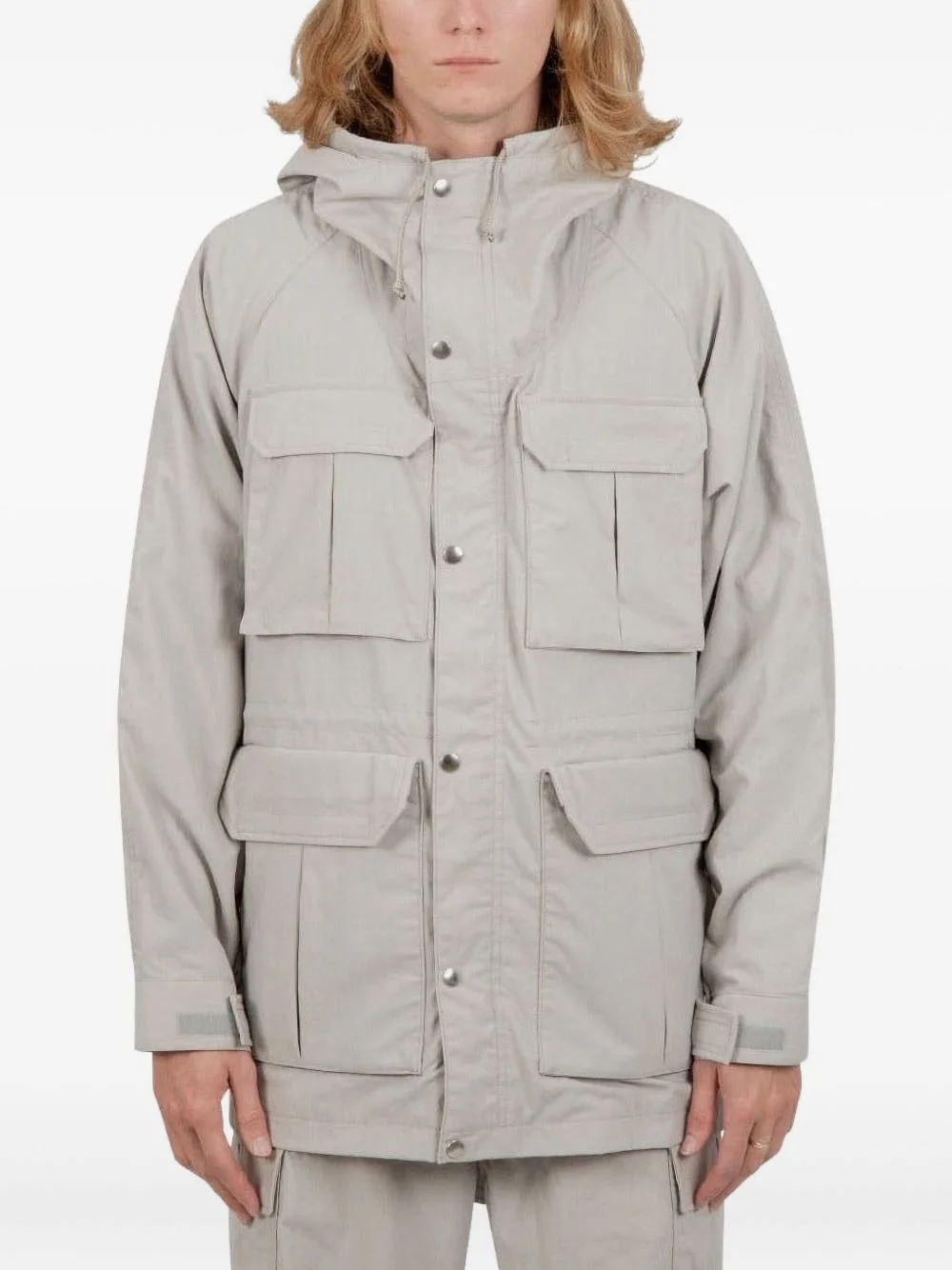hooded multi-pocket jacket Highlights - Light grey - Drawstring waist - Multiple pockets - Snap button fastening - Hooded neckline - Long sleeves Imported Composition Nylon 100% Washing instructions Read Manufacturer Guidelines