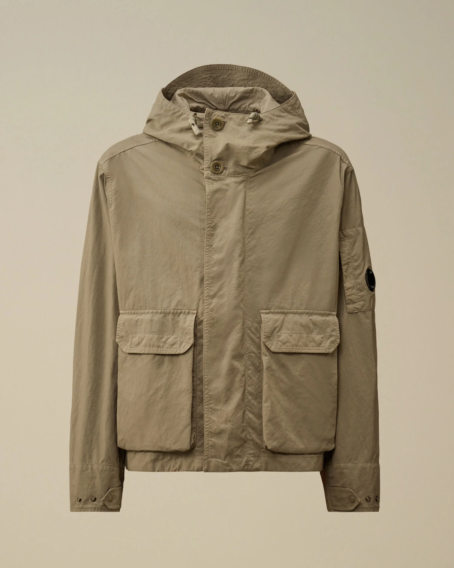 Hooded short jacket crafted in heavy-duty left-hand twill, woven from two nylon taslan yarns. The jacket features C.P. Company’s iconic Lens, a stand-up collar with a button placket, a hidden two-way full zip fastening, and front and side flap snap pockets. Unlined and garment dyed. Regular fit. - Stand-up collar with button placket - Adjustable visor hood - Hidden two-way full zip fastening with flap snap closure - Front and side flap snap pockets - Lens detail - Adjustable snap cuffs - Adjustable drawstring hem - Garment dyed - Unlined - Regular fit CARE & COMPOSITION Care - Wash max 30°C - Mild process - Do not bleach - Do not tumble dry - Ironing maximum temperature 110°C - without steam - Do not dry clean - Line dry in the shade - Wash separately - Wash inside out - Do not soak - Remove detachable accessories before washing Composition - External fabric: 100% Polyamide / Nylon - Lining: 100% Polyamide / Nylon SIZE & FITTING - Fits true to size, take your normal size - Model is 186 cm-6' 1" / 98-103 cm chest and is wearing a size L PRODUCT PASSPORT PRODUCT - Weaving: Korea - Dyeing: Italy - Confection: Romania - Releases plastic microfibers into the environment during washing PACKAGING - Minimum percentage of recycled materials 70%