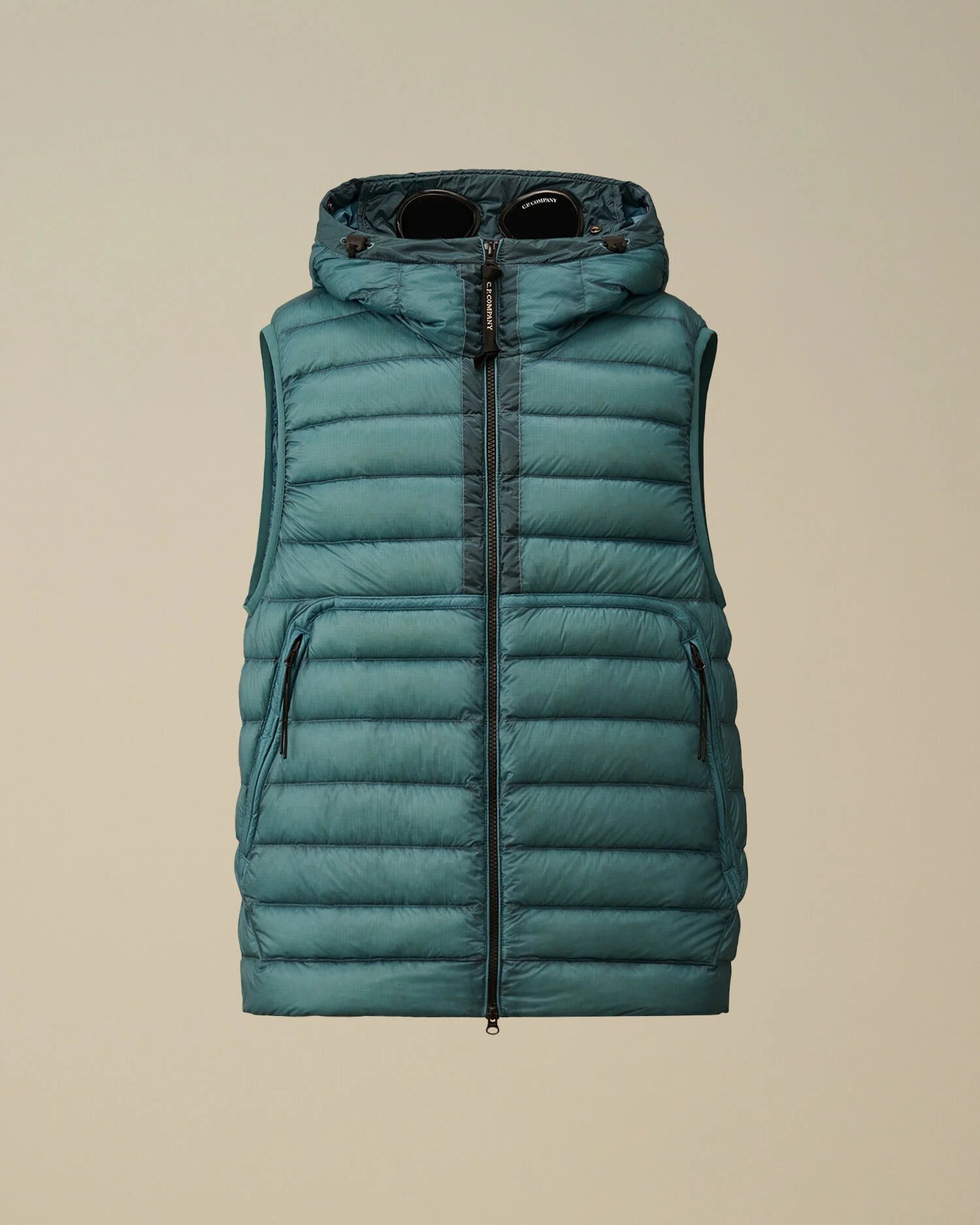 Goggle down gilet crafted in D.D. Shell, a micro-ripstop opaque 7-denier nylon. The lightness and transparency of the fabric emphasize the structure of the garment, while the Direct Down Injection process ensures optimal insulation. The gilet features C.P. Company’s iconic Goggle hood, a two-way full zip fastening, and side zip pockets. Finished with an adjustable drawstring hem. Regular fit. - Adjustable Goggle hood - Two-way full zip fastening - Side zip pockets - Adjustable drawstring hem - Regular fit CARE & COMPOSITION Care - Wash max 30°C - Mild process - Do not bleach - Do not tumble dry - Ironing maximum temperature 110°C - without steam - Do not dry clean - Line dry - Wash inside out - Remove detachable accessories before washing Composition - External fabric: 100% Polyamide / Nylon - Lining: 100% Polyamide / Nylon - Padding (Fiber): 100% Polyester - Padding (Feather): [53gr. - 95% ] 95% White duck down, 5% Feather SIZE & FITTING - Fits true to size, take your normal size - Model is 186 cm-6' 1" / 98-103 cm chest and is wearing a size L PRODUCT PASSPORT PRODUCT - Weaving: Korea - Dyeing: Korea - Confection: China - Releases plastic microfibers into the environment during washing PACKAGING - Minimum percentage of recycled materials 70%