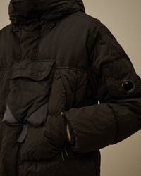 Hooded down jacket crafted in Eco-Chrome R Mixed, the evolution of Chrome-R using ECONYL®, a 100% regenerated nylon. The jacket features C.P. Company’s iconic Lens, a hidden two-way full zip fastening with a flap snap closure, and chest and side snap pockets. Mixed with Twill nylon taslan. Garment dyed with anti-drop treatment. Regular fit. - Adjustable hood - Hidden two-way full zip fastening with flap snap closure - Chest flap snap pocket - Side snap pockets - Lens detail - Ribbed cuffs - Adjustable drawstring hem - Garment dyed - Mixed with twill nylon taslan - Regular fit CARE & COMPOSITION Care - Wash max 30°C - Mild process - Do not bleach - Do not tumble dry - Ironing maximum temperature 110°C - without steam - Do not dry clean - Line dry - Wash separately - Reshape when damp - Remove detachable accessories before washing Composition - External fabric: 100% Polyamide / Nylon - Lining: 100% Polyamide / Nylon - Secondary fabric: 100% Polyamide / Nylon - Padding (Feather): [256gr. - 90% ] 90% Grey duck down, 10% Duck feather SIZE & FITTING - Fits true to size, take your normal size - Model is 186 cm-6' 1" / 98-103 cm chest and is wearing a size L PRODUCT PASSPORT PRODUCT - Weaving: Italy - Dyeing: Italy - Confection: Bulgaria - Product contains at least 40% of recycled material - Releases plastic microfibers into the environment during washing PACKAGING - Minimum percentage of recycled materials 70%