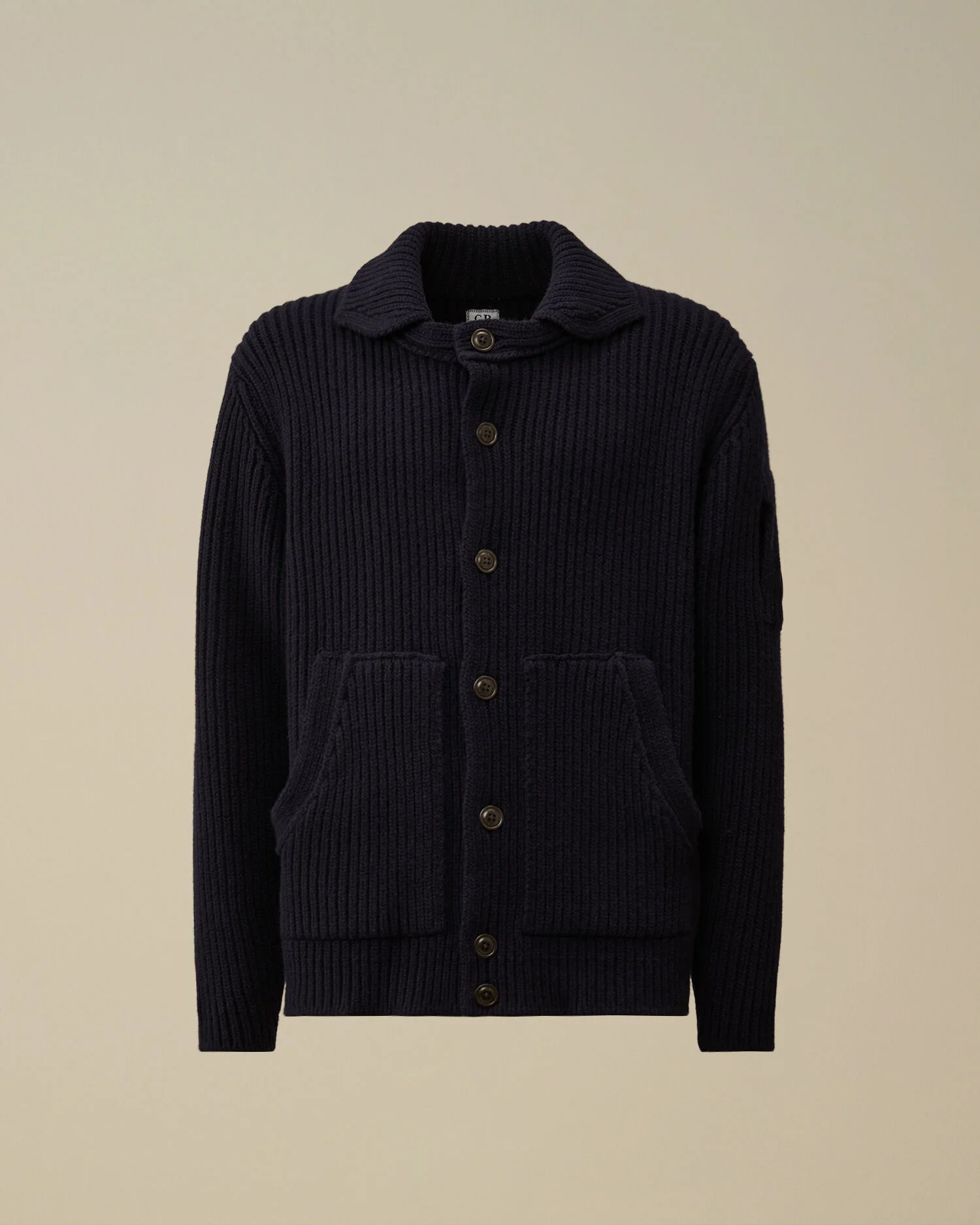 Button cardigan crafted in Lambswool GRS. The Global Recycled Standard certifies the use of products in conformity with environmental and social criteria throughout the production chain. The knit features a collar with a button tab, and C.P. Company’s iconic Lens. Complete with side pockets. Gauge 5. Regular fit. - Collar with button tab - Button fastening - Lens detail - Side pockets - 5 Gauge knit - Regular fit CARE & COMPOSITION Care - Hand wash - Do not bleach - Do not tumble dry - Ironing maximum temperature 110°C - without steam - Dry cleaning in tetrachloroethene - mild process - Flat drip dry in the shade - Do not soak - Remove detachable accessories before washing - Dry inside out Composition - External fabric: 80% Wool, 20% Polyamide / Nylon SIZE & FITTING - Fits true to size, take your normal size - Model is 186 cm-6' 1" / 98-103 cm chest and is wearing a size L PRODUCT PASSPORT PRODUCT - Weaving: Italy - Dyeing: Italy - Confection: Moldova - Product contains at least 50% of recycled material PACKAGING - Minimum percentage of recycled materials 70%