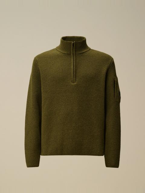 Half zip sweater crafted in Lambswool GRS*. The Global Recycled Standard certifies the use of products in conformity with environmental and social criteria extended to all stages of the production chain. The knit features a ribbed neck and C.P. Company’s iconic Lens. Gauge 5. Regular fit.*Lambswool items in the colour Gauze White are not produced using GRS-certified yarn. - Ribbed neck - Half zip fastening - Lens detail - 5 Gauge knit - Regular fit CARE & COMPOSITION Care - Hand wash - Do not bleach - Do not tumble dry - Ironing maximum temperature 110°C - without steam - Dry cleaning in tetrachloroethene - mild process - Flat drip dry in the shade - Remove detachable accessories before washing - Dry inside out Composition - External fabric: 80% Wool, 20% Polyamide / Nylon SIZE & FITTING - Fits true to size, take your normal size - Model is 186 cm-6' 1" / 98-103 cm chest and is wearing a size L PRODUCT PASSPORT PRODUCT - Weaving: Italy - Dyeing: Italy - Confection: Moldova - Product contains at least 50% of recycled material PACKAGING - Minimum percentage of recycled materials 70%