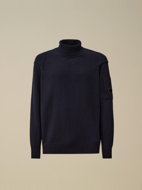 Turtleneck sweater crafted in Lambswool GRS*. The Global Recycled Standard certifies the use of products in conformity with environmental and social criteria extended to all stages of the production chain. The knit features C.P. Company’s iconic Lens, contrast stitching, ribbed cuffs and hem. Gauge 7. Regular fit.*Lambswool items in the colour Gauze White are not produced using GRS-certified yarn. - Ribbed turtleneck - Lens detail - Contrast stitching - Ribbed cuffs and hem - 7 Gauge knit - Regular fit CARE & COMPOSITION Care - Hand wash - Do not bleach - Do not tumble dry - Ironing maximum temperature 110°C - without steam - Dry cleaning in tetrachloroethene - mild process - Flat drip dry in the shade - Remove detachable accessories before washing - Dry inside out Composition - External fabric: 80% Wool, 20% Polyamide / Nylon SIZE & FITTING - Fits true to size, take your normal size - Model is 186 cm-6' 1" / 98-103 cm chest and is wearing a size L PRODUCT PASSPORT PRODUCT - Weaving: Italy - Dyeing: Italy - Confection: Moldova - Product contains at least 50% of recycled material PACKAGING - Minimum percentage of recycled materials 70%