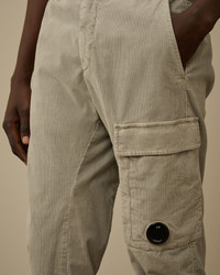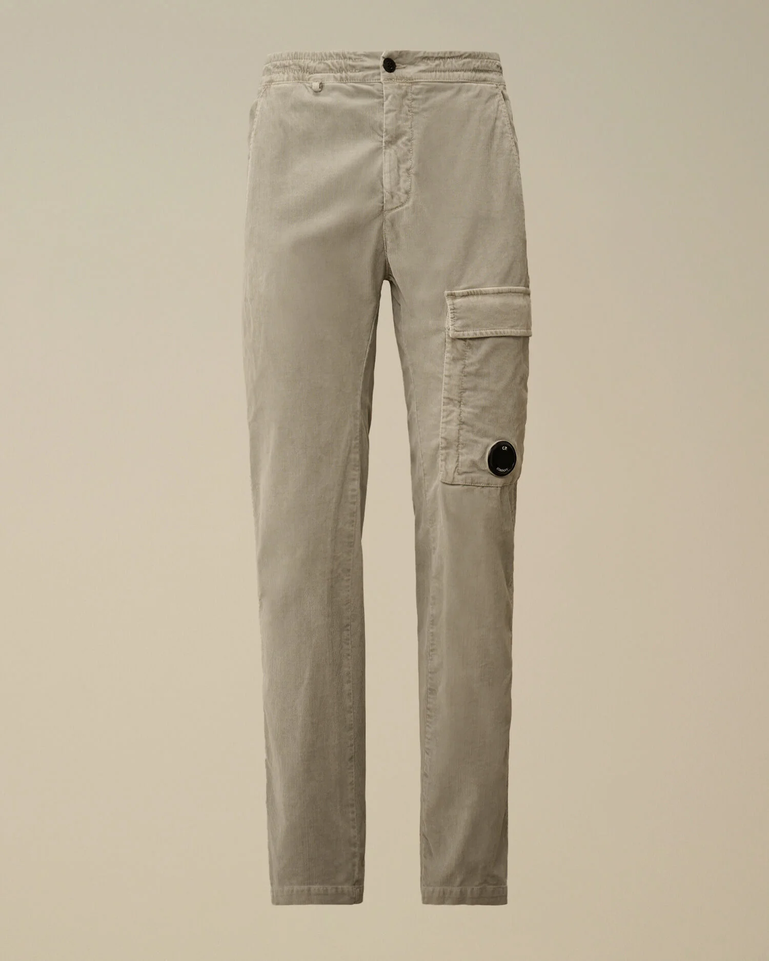 Cargo pants crafted in stretch velvet 1000 stripes. The pants feature C.P. Company’s iconic Lens, button and zip fastening, adjustable drawstring waistband, side pockets, and a cargo flap with a hidden zip pocket. Finished with back welt snap pockets with an applied label. Old dyed. Regular fit. - Adjustable drawstring waistband - Button and zip fastening - Side pockets - Cargo flap with hidden zip pocket and Lens detail - Back welt snap pockets with applied label - Old dyed - Regular fit CARE & COMPOSITION Care - Wash max 30°C - Mild process - Do not bleach - Do not tumble dry - Ironing maximum temperature 110°C - without steam - Do not dry clean - Line dry in the shade - Wash separately - Wash inside out - Do not twist or wring - Iron inside out - Remove detachable accessories before washing Composition - External fabric: 97% Cotton, 3% Elastane / Spandex SIZE & FITTING - Fits true to size, take your normal size - Model is 186 cm-6' 1"/ 88-91 cm waist and is wearing a size 48 PRODUCT PASSPORT PRODUCT - Weaving: Italy - Dyeing: Tunisia - Confection: Tunisia PACKAGING - Minimum percentage of recycled materials 70%