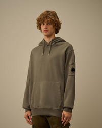 Hooded sweatshirt crafted in brushed and emerized diagonal-weave gauzed fleece. The soft fabric ensures comfort and ease of movement. The sweatshirt features an adjustable hood, C.P. Company’s iconic Lens, and a kangaroo pocket. Finished with ribbed cuffs and hem. The Resist Dyed process uses direct dyes on garments pre-treated with cationic resin, creating an irregular colour effect that enhances texture and details. Regular fit. - Adjustable hood - Lens detail - Kangaroo pocket - Ribbed cuffs and hem - Resist dyed - Regular fit CARE & COMPOSITION Care - Wash max 30°C - Do not bleach - Do not tumble dry - Ironing maximum temperature 150°C - Do not dry clean - Flat dry in the shade - Wash separately - Wash with similar colours - Wash inside out - Iron inside out - Do not iron decorations - Remove detachable accessories before washing - Do not expose the garment to direct sunlight or artificial light Composition - External fabric: 100% Cotton SIZE & FITTING - Fits true to size, take your normal size - Model is 186 cm-6' 1" / 98-103 cm chest and is wearing a size L PRODUCT PASSPORT PRODUCT - Weaving: Turkiye - Dyeing: Turkiye - Confection: Turkiye PACKAGING - Minimum percentage of recycled materials 70%
