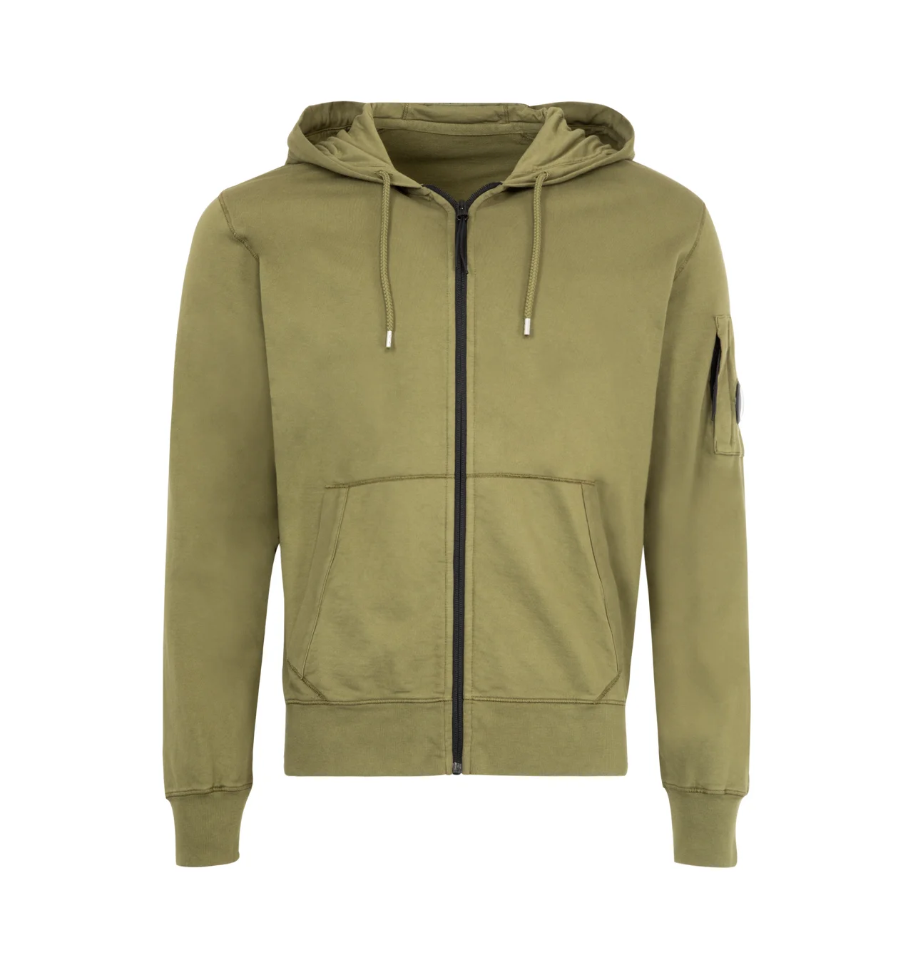 C.P. COMPANY Light Fleece Hooded Full Zip Sweatshirt featuring adjustable hood, full zip fastening, lens detail, ribbed cuffs and hem, garment dyed and regular fit. 100% cotton. DESIGNER STYLE ID: 19CMSS712A-002246G COLOR: 652 CAPERS