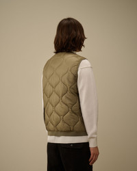 Padded gilet crafted in micro-ripstop opaque 7-denier quilted nylon. The lightness and transparency of the fabric emphasize the structure of the garment. The gilet features C.P. Company’s iconic Lens on the back, a full zip fastening with a button hem placket, and side snap pockets. Padded with Primaloft® Silver wadding, an insulation solution with high thermal and breathability properties. Regular fit. - V-neck - Full zip fastening with button hem placket - Side snap pockets - Lens detail on the back - Ribbed hem - Primaloft® Silver padding - Regular fit CARE & COMPOSITION Care - Wash max 30°C - Mild process - Do not bleach - Do not tumble dry - Ironing maximum temperature 110°C - without steam - Do not dry clean - Line dry - Wash separately - Remove detachable accessories before washing Composition - External fabric: 100% Polyamide / Nylon - Lining: 100% Polyamide / Nylon - Padding (Fiber): 100% Polyester - Secondary fabric: 100% Polyamide / Nylon - Secondary lining: 100% Polyamide / Nylon SIZE & FITTING - Fits true to size, take your normal size - Model is 186 cm-6' 1" / 98-103 cm chest and is wearing a size L PRODUCT PASSPORT PRODUCT - Weaving: Korea - Dyeing: Korea - Confection: China - Releases plastic microfibers into the environment during washing PACKAGING - Minimum percentage of recycled materials 70%