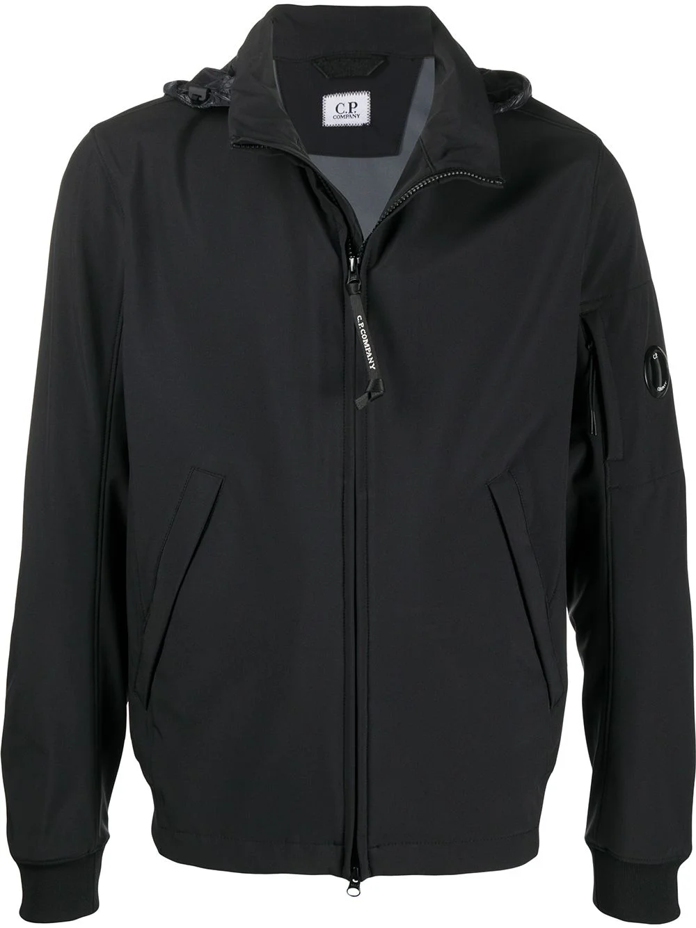 logo patch zipped jacket Black logo patch zipped jacket from C.P. Company featuring a stand up collar, a front zip fastening, two front pockets, long sleeves, a logo to the left arm, a ribbed hem and cuffs and a concealed hood. Imported Composition Lining: Polyamide 100% Outer: Polyester 94%, Spandex/Elastane 6% Washing instructions Machine Wash
