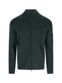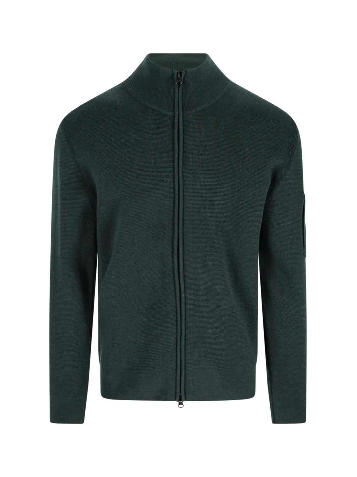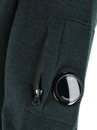 C.P. COMPANY LOGO ZIP SWEATER IN GREEN VIRGIN WOOL BLEND WITH CREW NECK, ZIP POCKET ON SLEEVE, GOGGLE LOGO DETAIL ON SLEEVE, STRAIGHT HEM. PRODUCT INFO PRODUCT CODE 19CMKN202A006595A699 COMPOSITION: 55% VIRGIN WOOL, 45% POLYESTER SIZE AND FIT: REGULAR FIT MADE IN: BULGARIA