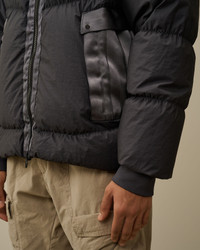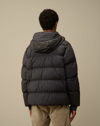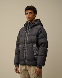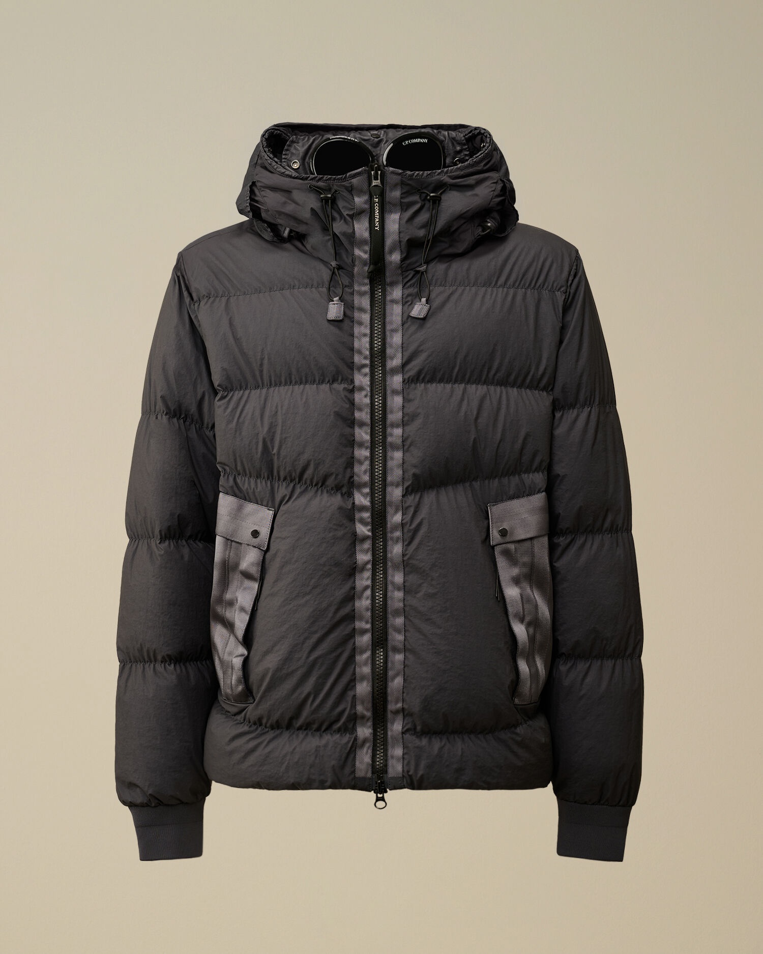 Goggle down jacket crafted in Bi-TM, a 20 denier nylon with polyurethane coating, and a opaque velour texture. Garment dyed anti-drop treated. - Adjustable Goggle hood - Two-way full zip fastening - Zip and flap pockets - Ribbed cuffs - Garment dyed - Regular fit CARE & COMPOSITION CARE - Wash max 30°C - Mild process - Do not bleach - Do not tumble dry - Ironing maximum temperature 110°C - without steam - Do not dry clean - Line dry in the shade - Wash separately - Wash inside out - Reshape when damp - Remove detachable accessories before washing COMPOSITION - External fabric: 100% Polyamide / Nylon - Lining: 100% Polyamide / Nylon - Secondary fabric: 73% Polyamide / Nylon, 27% Polyester - Padding: [208gr. - 90% ] 90% Grey duck down, 10% Grey Duck feather SIZE & FITTING - Fits true to size, take your normal size - Model is 186 cm-6' 1" / 98-103 cm chest and is wearing a size L