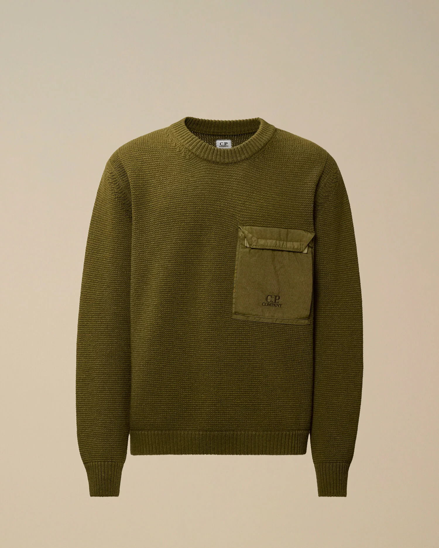 Crewneck sweater crafted in Lambswool, mixed with Taylon P. The knit features a chest flap snap pocket with embroidered logo detail, and ribbed cuffs and hem. Gauge 5. Regular fit. - Ribbed crewneck - Chest flap snap pocket with embroidered logo detail in Taylon P - Ribbed cuffs and hem - 5 Gauge knit - Regular fit CARE & COMPOSITION Care - Hand wash - Do not bleach - Do not tumble dry - Ironing maximum temperature 110°C - without steam - Dry cleaning in tetrachloroethene - mild process - Flat drip dry in the shade - Do not iron decorations - Fabric may release color - wash separately and inside out - Dry inside out Composition - External fabric: 80% Wool, 20% Polyamide / Nylon - Secondary fabric: 100% Polyamide / Nylon SIZE & FITTING - Fits true to size, take your normal size - Model is 186 cm-6' 1" / 98-103 cm chest and is wearing a size L PRODUCT PASSPORT PRODUCT - Weaving: Italy - Dyeing: Italy - Confection: Moldova - Product contains at least 50% of recycled material PACKAGING - Minimum percentage of recycled materials 70%