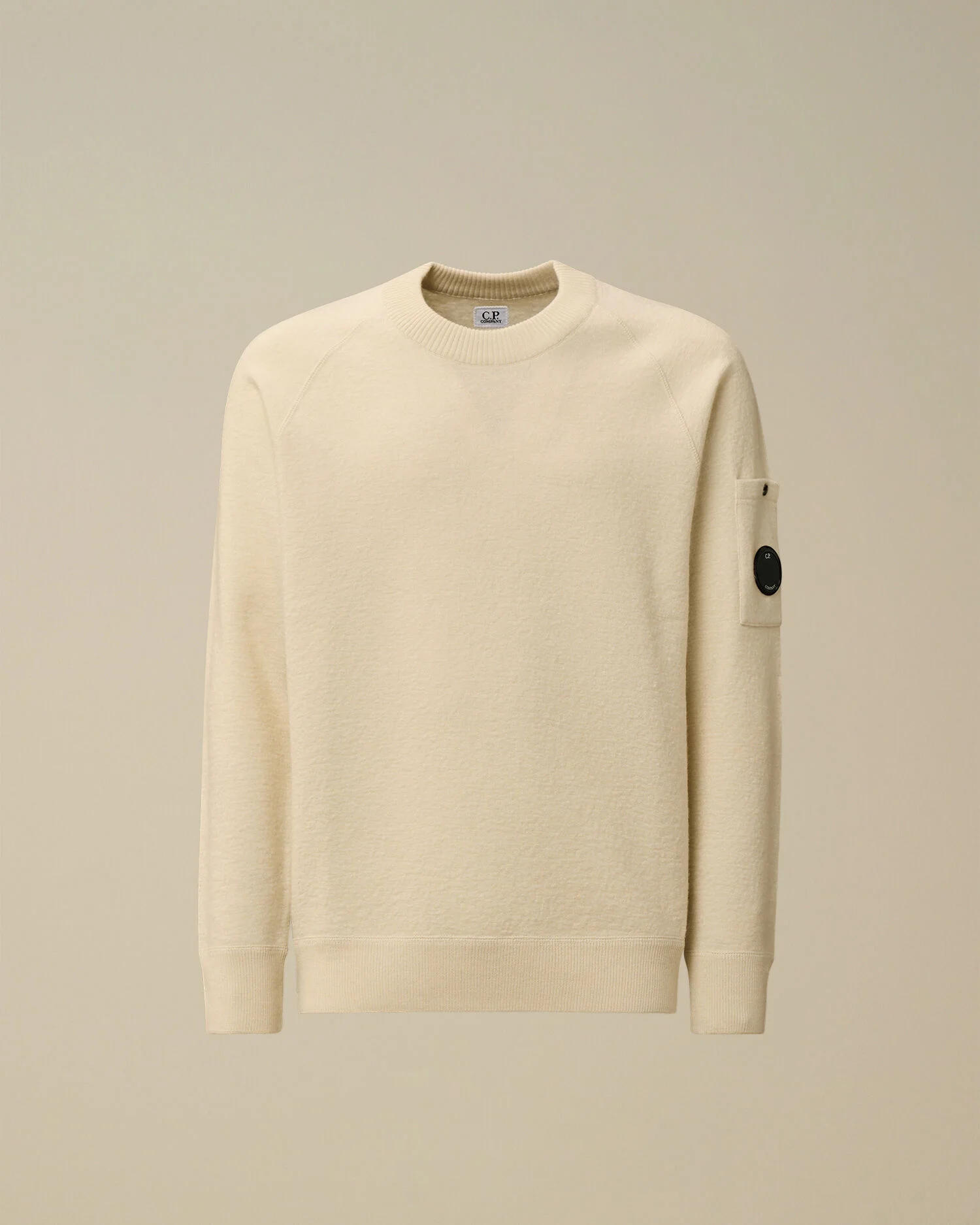 Crewneck sweater crafted in merino wool with a felted finish. The knit features raglan sleeves, C.P. Company’s iconic Lens, ribbed cuffs and hem. Gauge 12. Regular fit. - Ribbed crewneck - Raglan sleeves - Lens detail - Ribbed cuffs and hem - 12 Gauge knit - Regular fit CARE & COMPOSITION Care - Do not wash - Do not bleach - Do not tumble dry - Ironing maximum temperature 110°C - without steam - Dry cleaning in tetrachloroethene - mild process - Remove detachable accessories before washing Composition - External fabric: 55% Wool, 45% Cotton SIZE & FITTING - Fits true to size, take your normal size - Model is 186 cm-6' 1" / 98-103 cm chest and is wearing a size L PRODUCT PASSPORT PRODUCT - Weaving: India - Dyeing: India - Confection: India PACKAGING - Minimum percentage of recycled materials 70%