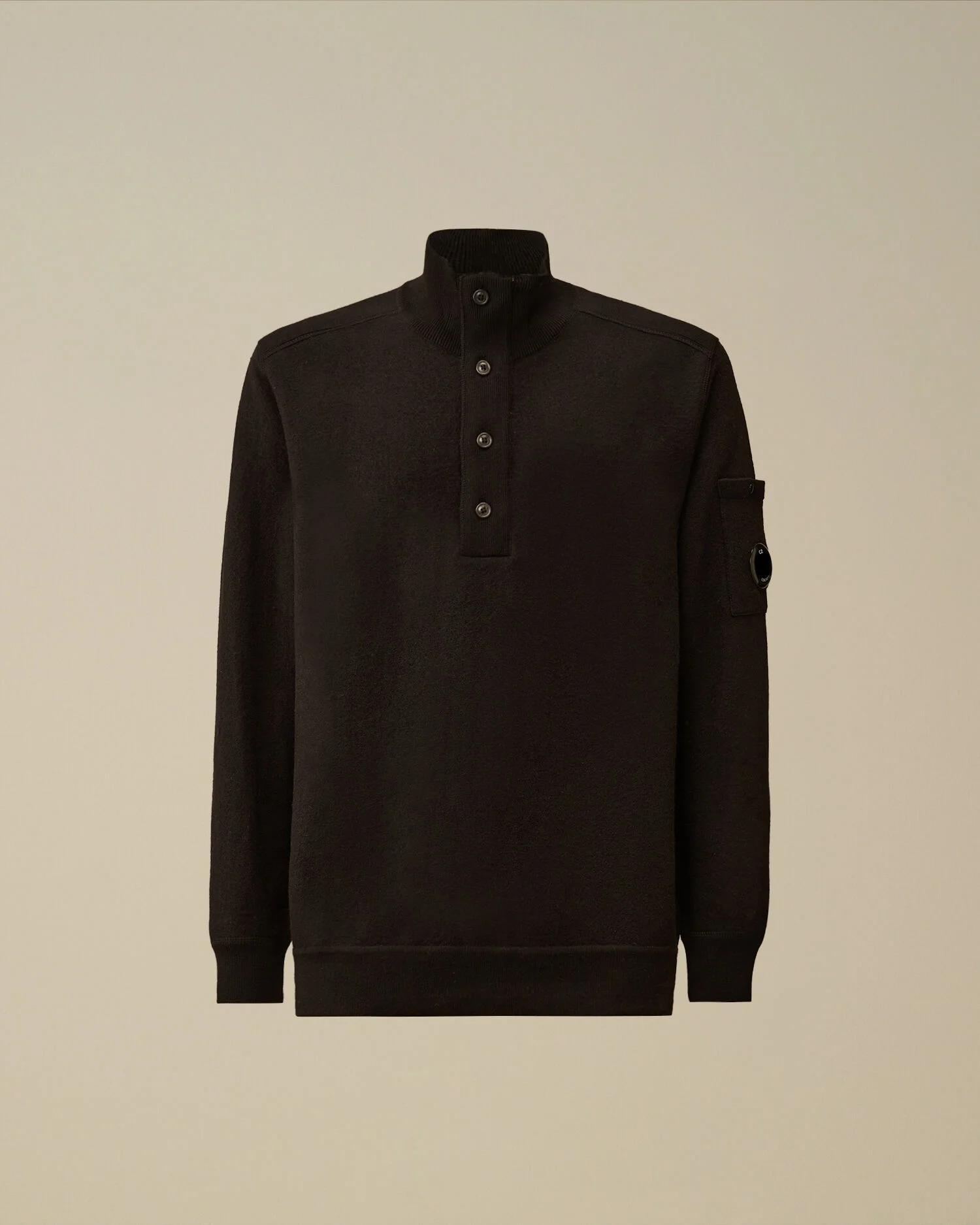 Half button sweater crafted in merino wool with a felted finish. The knit features a ribbed collar, C.P. Company’s iconic Lens, and ribbed cuffs. Gauge 12. Regular fit. - Ribbed collar - Half button fastening - Lens detail - Ribbed cuffs - 12 Gauge knit - Regular fit CARE & COMPOSITION Care - Do not wash - Do not bleach - Do not tumble dry - Ironing maximum temperature 110°C - without steam - Dry cleaning in tetrachloroethene - mild process - Do not soak - Remove detachable accessories before washing Composition - External fabric: 55% Wool, 45% Cotton SIZE & FITTING - Fits true to size, take your normal size - Model is 186 cm-6' 1" / 98-103 cm chest and is wearing a size L PRODUCT PASSPORT PRODUCT - Weaving: India - Dyeing: India - Confection: India PACKAGING - Minimum percentage of recycled materials 70%