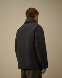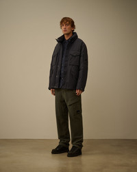Field down jacket crafted in Micro-M (R), a multifilament barrier layer evolution of the 50 Fili. The cotton thread is replaced with a hydrophobic Polyester microfiber, while the nylon one is substituted with a recycled Polyester yarn. The jacket features a concealable snap hood, hidden two-way full zip fastening with flap snap closure, and C.P. Company’s iconic Lens detail. Complete with chest and front patch button pockets, inner zip pocket, adjustable flap snap cuffs, and an adjustable drawstring hem and waist. Water-resistant and breathable. Regular fit. - Concealable snap hood - Hidden two-way full zip fastening with flap snap closure - Lens detail - Chest and front patch button pockets - Inner zip pocket - Adjustable flap snap cuffs - Adjustable drawstring hem and waist - Regular fit CARE & COMPOSITION Care - Wash max 30°C - Mild process - Do not bleach - Do not tumble dry - Ironing maximum temperature 110°C - without steam - Do not dry clean - Line dry - Wash separately - Remove detachable accessories before washing Composition - External fabric: 100% Polyester - Lining: 100% Polyamide / Nylon - Secondary lining: 100% Cotton - Padding (Feather): [173gr. - 90% ] 90% White duck down, 10% Feather SIZE & FITTING - Fits true to size, take your normal size - Model is 186 cm-6' 1" / 98-103 cm chest and is wearing a size L PRODUCT PASSPORT PRODUCT - Weaving: Japan - Dyeing: Japan - Confection: China - Product contains at least 50% of recycled material - Releases plastic microfibers into the environment during washing PACKAGING - Minimum percentage of recycled materials 70%