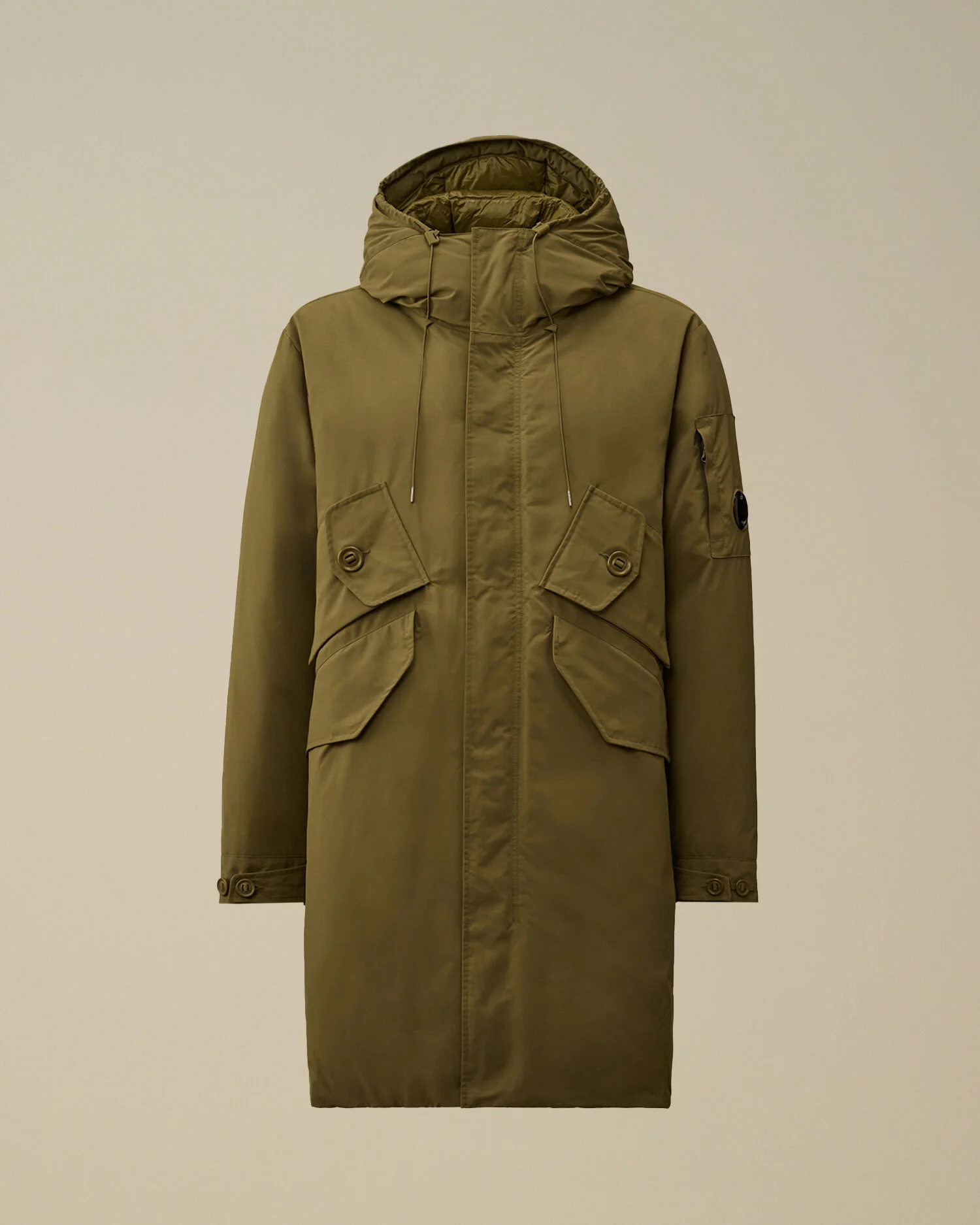 Long down jacket crafted in Micro-M (R), a multifilament barrier layer evolution of the 50 Fili. The cotton thread is replaced with a hydrophobic Polyester microfiber, while the nylon one is substituted with a recycled Polyester yarn. The jacket features an adjustable hood, hidden two-way full zip fastening with flap snap closure, and C.P. Company’s iconic Lens detail. Complete with chest patch button pockets, front flap snap pockets, inner zip pocket, and adjustable button cuffs. Water-resistant and breathable. Regular fit. - Adjustable hood - Hidden two-way full zip fastening with flap snap closure - Lens detail - Chest patch button pockets - Front flap snap pockets - Inner zip pocket - Adjustable button cuffs - Regular fit CARE & COMPOSITION Care - Wash max 30°C - Mild process - Do not bleach - Do not tumble dry - Ironing maximum temperature 110°C - without steam - Do not dry clean - Line dry - Wash separately - Remove detachable accessories before washing Composition - External fabric: 100% Polyester - Lining: 100% Polyamide / Nylon - Secondary lining: 100% Cotton - Padding (Feather): [234gr. - 90% ] 90% White duck down, 10% Feather SIZE & FITTING - Fits true to size, take your normal size - Model is 186 cm-6' 1" / 98-103 cm chest and is wearing a size L PRODUCT PASSPORT PRODUCT - Weaving: Japan - Dyeing: Japan - Confection: China - Product contains at least 50% of recycled material - Releases plastic microfibers into the environment during washing PACKAGING - Minimum percentage of recycled materials 70%