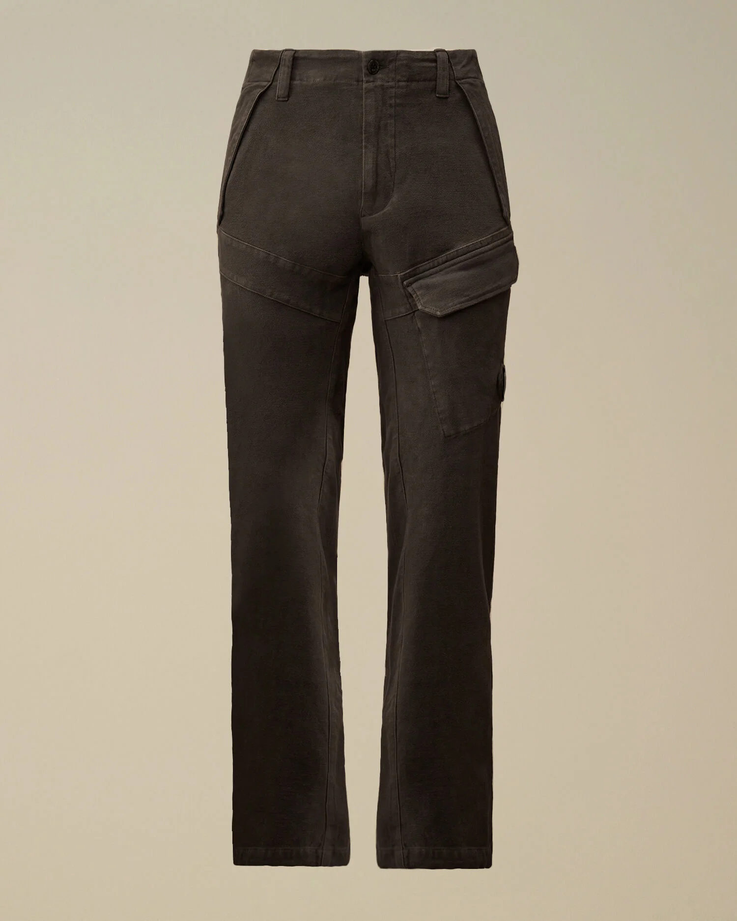 Cargo pants crafted in stretch cotton moleskin. The pants feature button and zip fastening with belt loops, side flap pockets, and a cargo flap pocket with C.P. Company’s iconic Lens. Finished with a back welt button pocket, a back flap button pocket with an applied logo label, and adjustable drawstring hems. Garment dyed. Regular fit. - Button and zip fastening - Belt loops - Side flap pockets - Cargo flap pocket with Lens detail - Back welt button pocket - Back flap button pocket with applied logo label - Adjustable drawstring hems - Garment dyed - Regular fit CARE & COMPOSITION Care - Wash max 30°C - Mild process - Do not bleach - Do not tumble dry - Ironing maximum temperature 110°C - without steam - Do not dry clean - Line dry - Wash separately - Wash inside out - Iron inside out - Remove detachable accessories before washing Composition - External fabric: 99% Cotton, 1% Elastane / Spandex SIZE & FITTING - Fits true to size, take your normal size - Model is 186 cm-6' 1"/ 88-91 cm waist and is wearing a size 48 PRODUCT PASSPORT PRODUCT - Weaving: Italy - Dyeing: Tunisia - Confection: Tunisia PACKAGING - Minimum percentage of recycled materials 70%