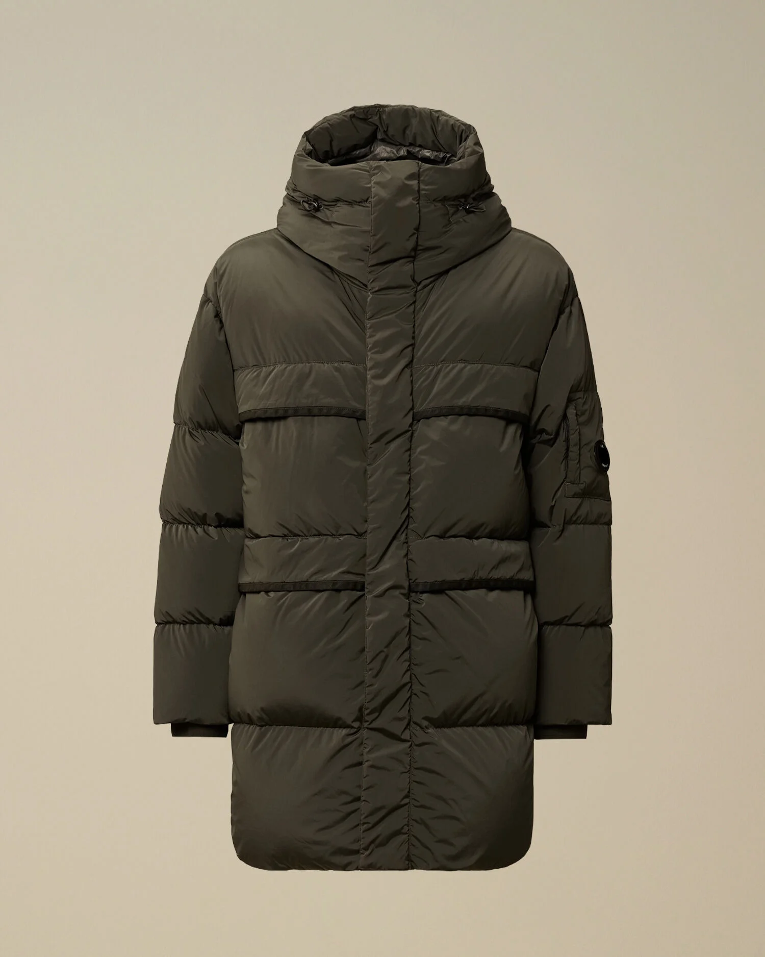 Long hooded down jacket crafted in Nycra-R, a stretch multifilament nylon made from ECONYL® 100% regenerated yarn, certified by the Global Recycled Standard (GRS). The jacket features an adjustable drawstring hood, a hidden two-way full zip fastening with a flap snap closure, and hidden zip pockets on the chest and front. Finished with C.P. Company’s iconic Lens, inner elasticated cuffs, and adjustable drawstring hem and waist. Garment dyed with anti-drop treatment. Regular fit. - Adjustable drawstring hood - Hidden two-way full zip fastening with flap snap closure - Hidden chest and front zip pockets - Lens detail - Inner elasticated cuffs - Adjustable drawstring hem and waist - Garment dyed - Regular fit CARE & COMPOSITION Care - Wash max 30°C - Mild process - Do not bleach - Do not tumble dry - Ironing maximum temperature 110°C - without steam - Do not dry clean - Line dry - Wash separately - Reshape when damp - Remove detachable accessories before washing Composition - External fabric: 92% Polyamide / Nylon, 8% Elastane / Spandex - Lining: 100% Polyamide / Nylon - Padding (Feather): [302gr. - 90% ] 90% Grey duck down, 10% Grey Duck feather SIZE & FITTING - Fits true to size, take your normal size - Model is 186 cm-6' 1" / 98-103 cm chest and is wearing a size L PRODUCT PASSPORT PRODUCT - Weaving: Italy - Dyeing: Italy - Confection: Bulgaria - Product contains at least 60% of recycled material - Releases plastic microfibers into the environment during washing PACKAGING - Minimum percentage of recycled materials 70%