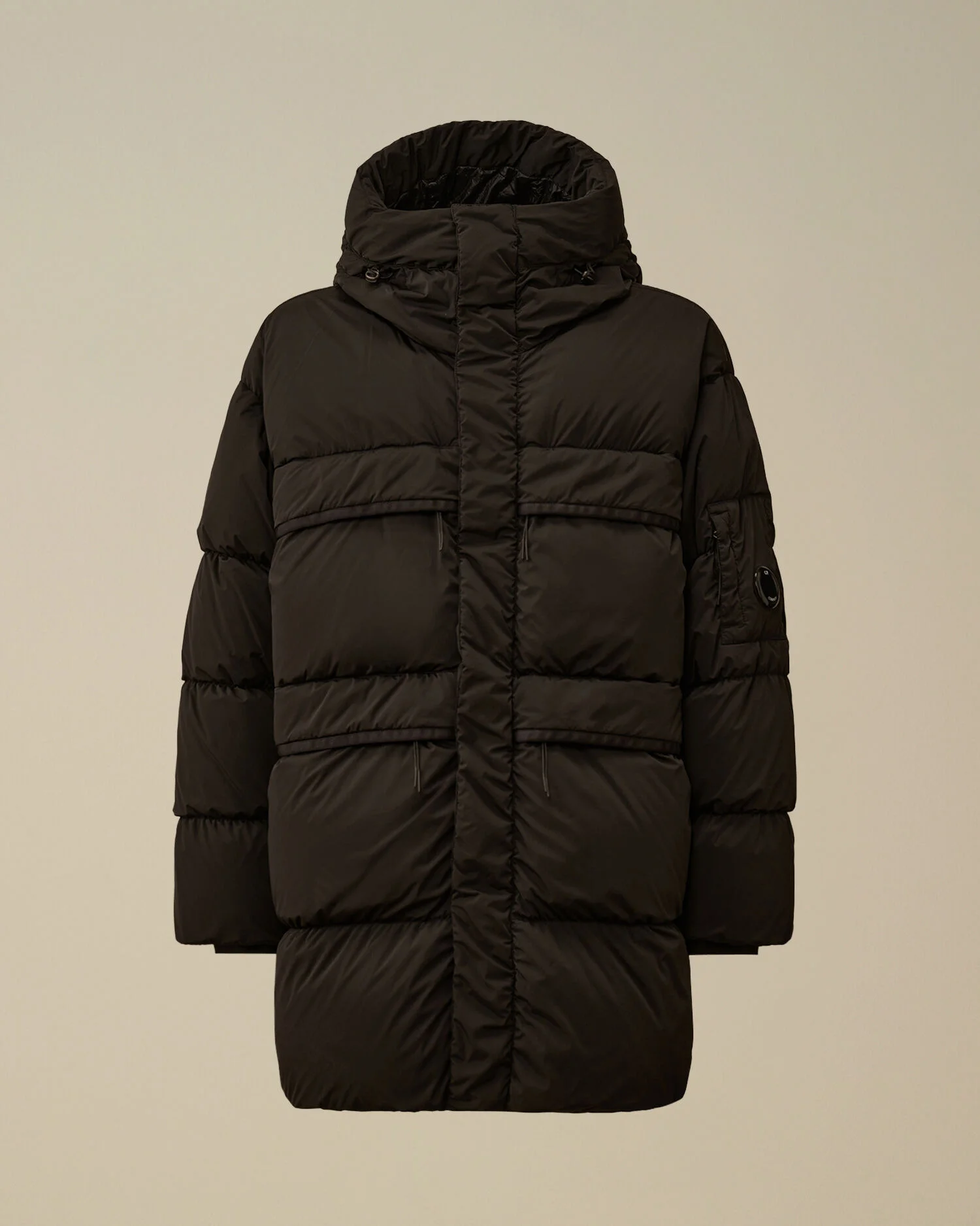 Long hooded down jacket crafted in Nycra-R, a stretch multifilament nylon made from ECONYL® 100% regenerated yarn, certified by the Global Recycled Standard (GRS). The jacket features an adjustable drawstring hood, a hidden two-way full zip fastening with a flap snap closure, and hidden zip pockets on the chest and front. Finished with C.P. Company’s iconic Lens, inner elasticated cuffs, and adjustable drawstring hem and waist. Garment dyed with anti-drop treatment. Regular fit. - Adjustable drawstring hood - Hidden two-way full zip fastening with flap snap closure - Hidden chest and front zip pockets - Lens detail - Inner elasticated cuffs - Adjustable drawstring hem and waist - Garment dyed - Regular fit CARE & COMPOSITION Care - Wash max 30°C - Mild process - Do not bleach - Do not tumble dry - Ironing maximum temperature 110°C - without steam - Do not dry clean - Line dry - Wash separately - Reshape when damp - Remove detachable accessories before washing Composition - External fabric: 92% Polyamide / Nylon, 8% Elastane / Spandex - Lining: 100% Polyamide / Nylon - Padding (Feather): [302gr. - 90% ] 90% Grey duck down, 10% Grey Duck feather SIZE & FITTING - Fits true to size, take your normal size - Model is 186 cm-6' 1" / 98-103 cm chest and is wearing a size L PRODUCT PASSPORT PRODUCT - Weaving: Italy - Dyeing: Italy - Confection: Bulgaria - Product contains at least 60% of recycled material - Releases plastic microfibers into the environment during washing PACKAGING - Minimum percentage of recycled materials 70%