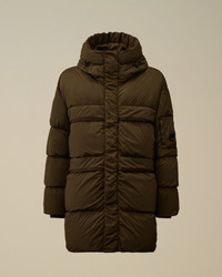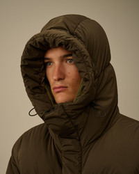 Long hooded down jacket crafted in Nycra-R, a stretch multifilament nylon made from ECONYL® 100% regenerated yarn, certified by the Global Recycled Standard (GRS). The jacket features an adjustable drawstring hood, a hidden two-way full zip fastening with a flap snap closure, and hidden zip pockets on the chest and front. Finished with C.P. Company’s iconic Lens, inner elasticated cuffs, and adjustable drawstring hem and waist. Garment dyed with anti-drop treatment. Regular fit. - Adjustable drawstring hood - Hidden two-way full zip fastening with flap snap closure - Hidden chest and front zip pockets - Lens detail - Inner elasticated cuffs - Adjustable drawstring hem and waist - Garment dyed - Regular fit CARE & COMPOSITION Care - Wash max 30°C - Mild process - Do not bleach - Do not tumble dry - Ironing maximum temperature 110°C - without steam - Do not dry clean - Line dry - Wash separately - Reshape when damp - Remove detachable accessories before washing Composition - External fabric: 92% Polyamide / Nylon, 8% Elastane / Spandex - Lining: 100% Polyamide / Nylon - Padding (Feather): [302gr. - 90% ] 90% Grey duck down, 10% Grey Duck feather SIZE & FITTING - Fits true to size, take your normal size - Model is 186 cm-6' 1" / 98-103 cm chest and is wearing a size L PRODUCT PASSPORT PRODUCT - Weaving: Italy - Dyeing: Italy - Confection: Bulgaria - Product contains at least 60% of recycled material - Releases plastic microfibers into the environment during washing PACKAGING - Minimum percentage of recycled materials 70%