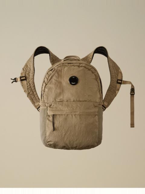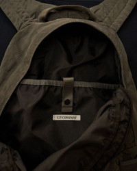 Backpack crafted in Nylon B, a military-inspired satin multi-filament nylon. The backpack features adjustable straps with buckles, padded shoulder straps, and a carry handle. The design includes a hidden zip pocket with C.P. Company’s iconic Lens, a bottom zip pocket, side mesh, and an inner snap pocket. Garment dyed and anti-drop treated. - Adjustable strap and buckle - Padded shoulder straps - Carry handle - Lens detail with hidden zip pocket - Bottom zip pocket - Side mesh - Inner snap pocket - Garment dyed CARE & COMPOSITION Care - Wash max 30°C - Mild process - Do not bleach - Do not tumble dry - Do not iron - Do not dry clean - Line dry - Wash separately - Remove detachable accessories before washing Composition - External fabric: 100% Polyamide / Nylon - Lining: 100% Polyester - Secondary fabric: 100% Polyester - Third fabric: 87% Polyester, 13% Elastane / Spandex PRODUCT PASSPORT PRODUCT - Weaving: Korea - Dyeing: China - Confection: China - Releases plastic microfibers into the environment during washing PACKAGING - Minimum percentage of recycled materials 70%