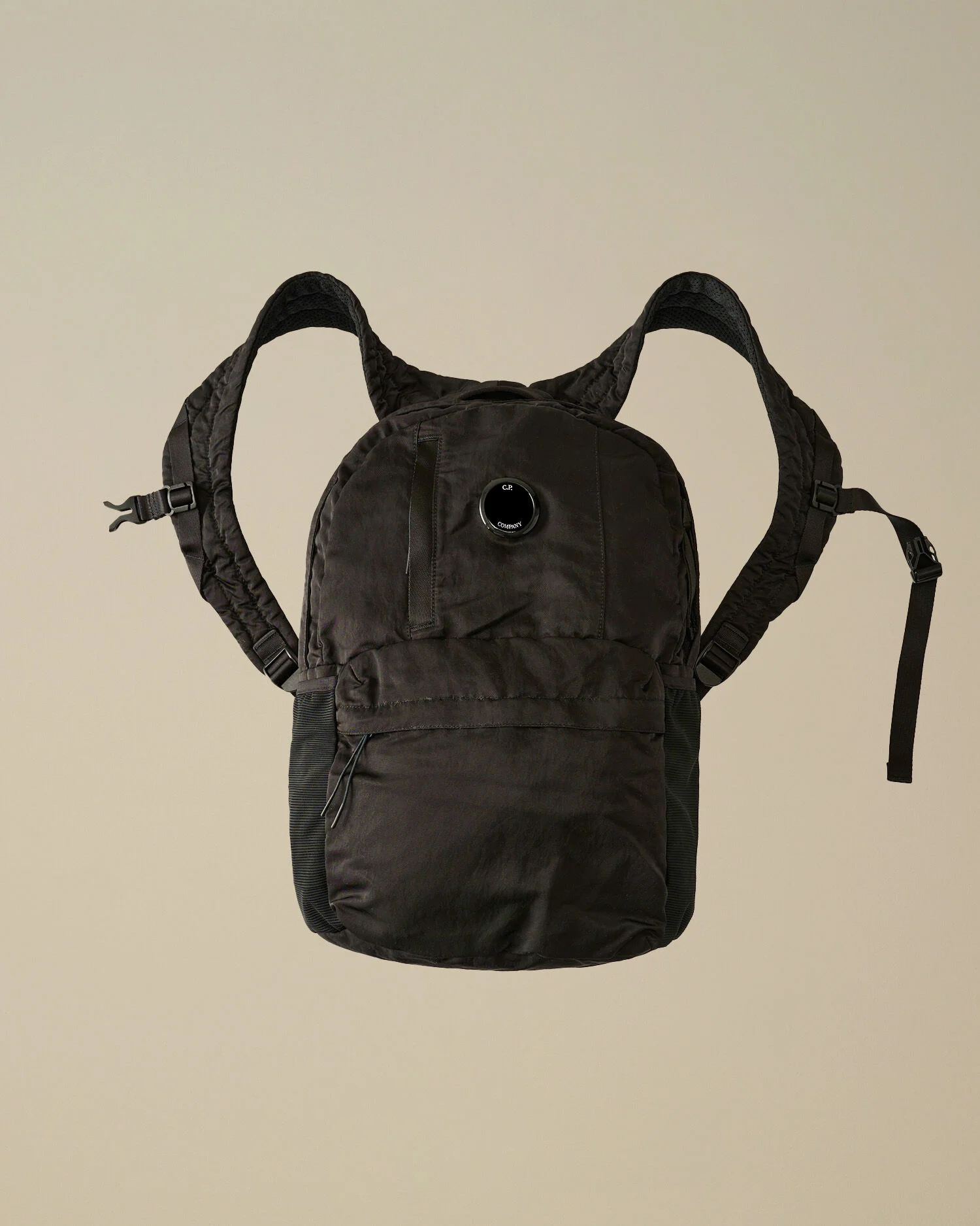 Backpack crafted in Nylon B, a military-inspired satin multi-filament nylon. The backpack features adjustable straps with buckles, padded shoulder straps, and a carry handle. The design includes a hidden zip pocket with C.P. Company’s iconic Lens, a bottom zip pocket, side mesh, and an inner snap pocket. Garment dyed and anti-drop treated. - Adjustable strap and buckle - Padded shoulder straps - Carry handle - Lens detail with hidden zip pocket - Bottom zip pocket - Side mesh - Inner snap pocket - Garment dyed CARE & COMPOSITION Care - Wash max 30°C - Mild process - Do not bleach - Do not tumble dry - Do not iron - Do not dry clean - Line dry - Wash separately - Remove detachable accessories before washing Composition - External fabric: 100% Polyamide / Nylon - Lining: 100% Polyester - Secondary fabric: 100% Polyester - Third fabric: 87% Polyester, 13% Elastane / Spandex PRODUCT PASSPORT PRODUCT - Weaving: Korea - Dyeing: China - Confection: China - Releases plastic microfibers into the environment during washing PACKAGING - Minimum percentage of recycled materials 70%