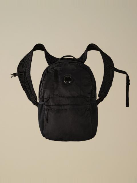 Backpack crafted in Nylon B, a military-inspired satin multi-filament nylon. The backpack features adjustable straps with buckles, padded shoulder straps, and a carry handle. The design includes a hidden zip pocket with C.P. Company’s iconic Lens, a bottom zip pocket, side mesh, and an inner snap pocket. Garment dyed and anti-drop treated. - Adjustable strap and buckle - Padded shoulder straps - Carry handle - Lens detail with hidden zip pocket - Bottom zip pocket - Side mesh - Inner snap pocket - Garment dyed CARE & COMPOSITION Care - Wash max 30°C - Mild process - Do not bleach - Do not tumble dry - Do not iron - Do not dry clean - Line dry - Wash separately - Remove detachable accessories before washing Composition - External fabric: 100% Polyamide / Nylon - Lining: 100% Polyester - Secondary fabric: 100% Polyester - Third fabric: 87% Polyester, 13% Elastane / Spandex PRODUCT PASSPORT PRODUCT - Weaving: Korea - Dyeing: China - Confection: China - Releases plastic microfibers into the environment during washing PACKAGING - Minimum percentage of recycled materials 70%