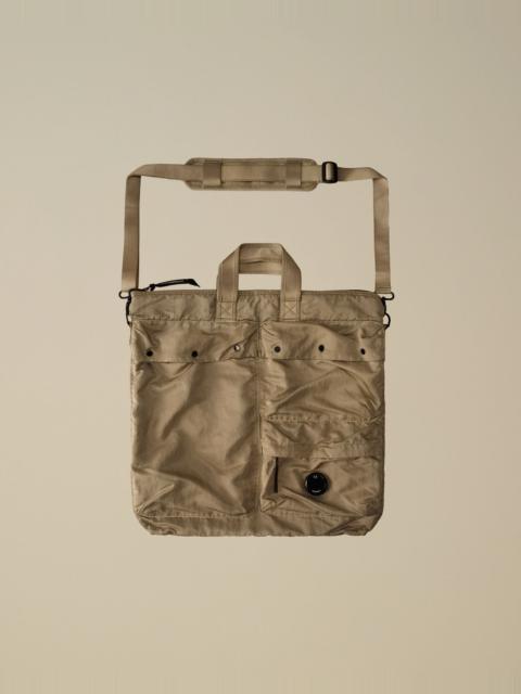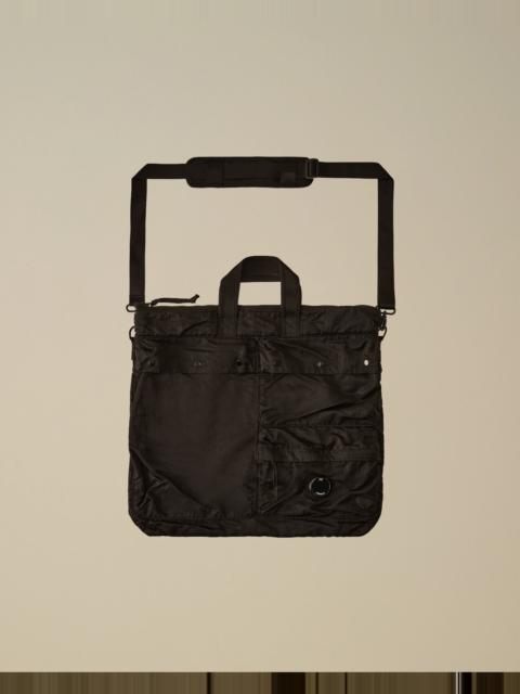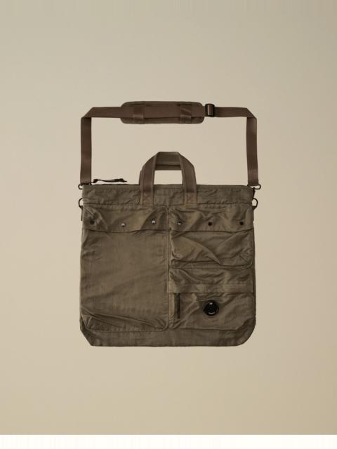 Shoulder bag crafted in Nylon B, a military-inspired satin multi-filament nylon. The bag features adjustable shoulder straps, carry handles, and zip pockets. Additional features include external front snap pockets, a snap pocket on the reverse, and a hidden zip pocket with C.P. Company’s iconic Lens. Inside, it contains a zip pocket with a logo detail and a mesh pocket. Garment dyed and anti-drop treated. - Adjustable shoulder strap - Carry handles - Zip pocket - External front snap pockets - Snap pocket on reverse - Lens detail with hidden zip pocket - Inner zip pocket with logo detail - Inner mesh pocket - Garment dyed CARE & COMPOSITION Care - Wash max 30°C - Mild process - Do not bleach - Do not tumble dry - Do not iron - Do not dry clean - Line dry - Wash separately - Remove detachable accessories before washing Composition - External fabric: 100% Polyamide / Nylon - Lining: 100% Polyester - Secondary lining: 87% Polyester, 13% Elastane / Spandex PRODUCT PASSPORT PRODUCT - Weaving: Korea - Dyeing: China - Confection: China - Releases plastic microfibers into the environment during washing PACKAGING - Minimum percentage of recycled materials 70%