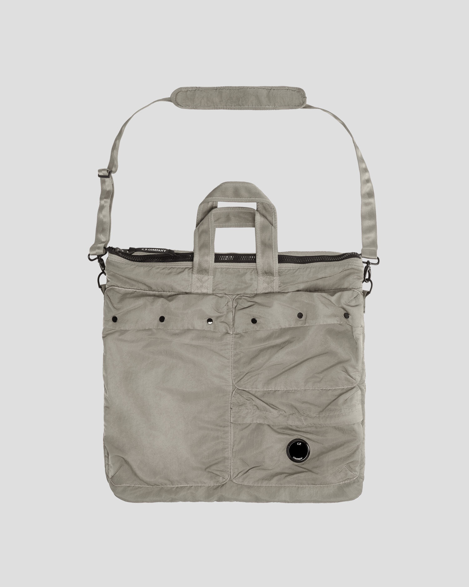 Large and versatile tote bag with handles, a zipped main compartment and secure external pockets. The bag also features the C.P. Company Lens detail. Made in Nylon B, a durable and water-resistant weave that's fine-tuned specifically for garment dyeing, yielding increased chromatic depth and intensity throughout the piece. - Weather resistant nylon sateen - Handles - Zipped main compartment - Secure external pockets - Lens detail - Garment dyed CARE & COMPOSITION CARE - Wash max 30°C - Mild process - Do not bleach - Do not tumble dry - Do not iron - Do not dry clean - Line dry - Wash separately - Remove detachable accessories before washing COMPOSITION - External fabric: 100% Polyamide / Nylon - Lining: 100% Polyester - Secondary fabric: 100% Polyamide / Nylon - Third fabric: 100% Polyester