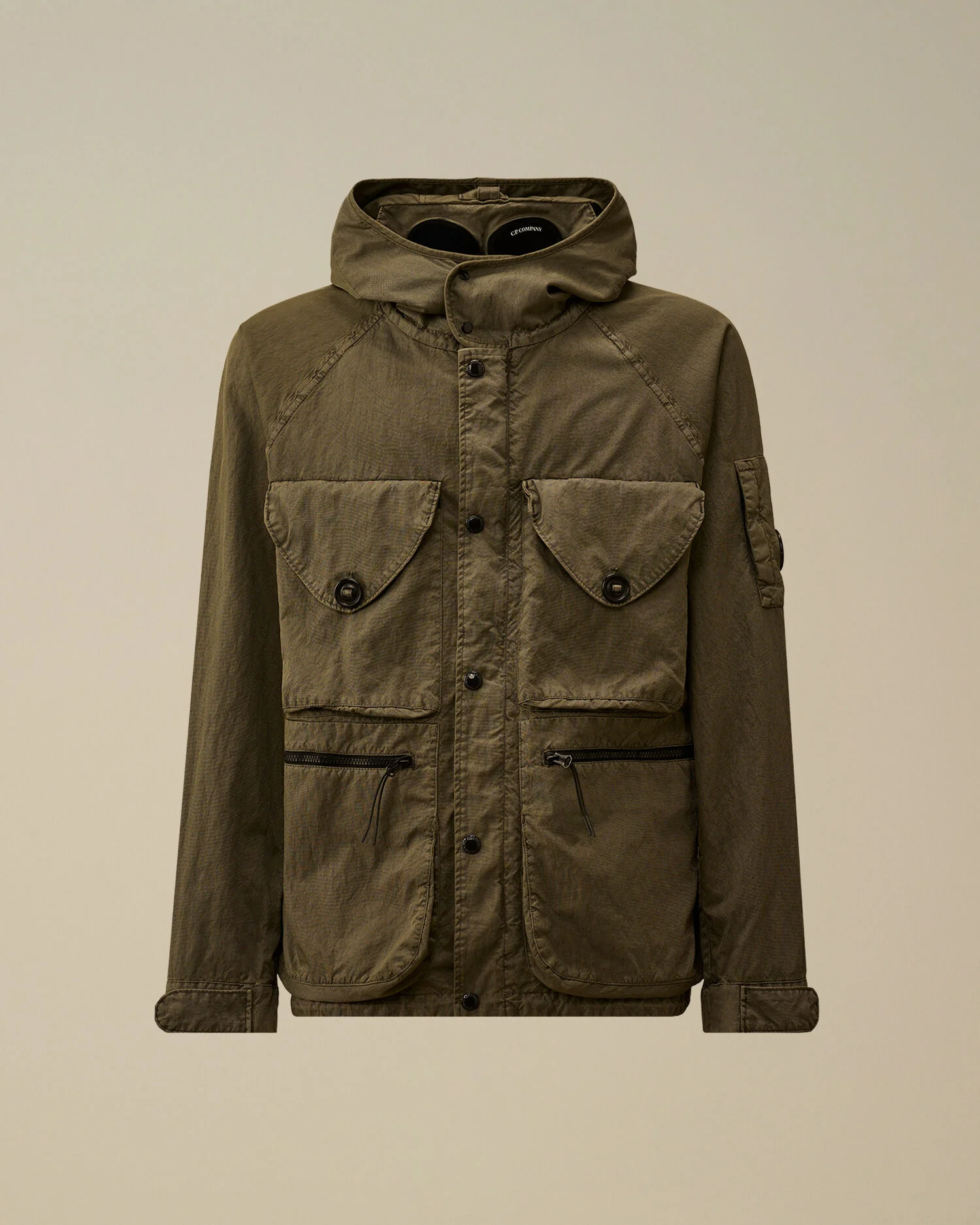 Goggle jacket crafted from Panama-R, an Oxford fabric made with recycled nylon yarns. The garment features an outer hood with a placket and snap buttons, and an inner adjustable Goggle hood in Taylon P, a heavy taslanised nylon. Equipped with a full two-way zip fastening concealed by a snap-button flap, flap chest pockets with button closure, zipped front pockets, and the iconic C.P. Company Lens on the sleeve pocket. Adjustable cuffs with snap-buttoned tabs, along with drawstrings at the waist and hem, ensure comfort and protection. Pigment dyed to give the fabric a unique, lived-in look with distinctive tonal variations. Regular fit. - External hood with snap face guard - Inner adjustable Goggle hood in Taylon P - Hidden two-way full zip fastening with flap snap closure - Chest patch pockets with flap and button - Front zip pockets - Lens detail - Adjustable flap snap cuffs - Adjustable drawstring waist and hem - Pigment dyed - Regular fit CARE & COMPOSITION Care - Wash max 30°C - Mild process - Do not bleach - Do not tumble dry - Ironing maximum temperature 110°C - without steam - Do not dry clean - Line dry - Wash separately - Wash inside out - Remove detachable accessories before washing Composition - External fabric: 100% Polyamide / Nylon - Lining: 100% Polyamide / Nylon - Secondary fabric: 100% Polyamide / Nylon - Secondary lining: 100% Polyamide / Nylon SIZE & FITTING - Model is 192 cm-6' 3.5" and is wearing a size L - Fit: Regular PRODUCT PASSPORT PRODUCT - Weaving: Korea - Dyeing: Italy - Confection: Bulgaria - Product contains at least 90% of recycled material - Releases plastic microfibers into the environment during washing PACKAGING - Minimum percentage of recycled materials 70%
