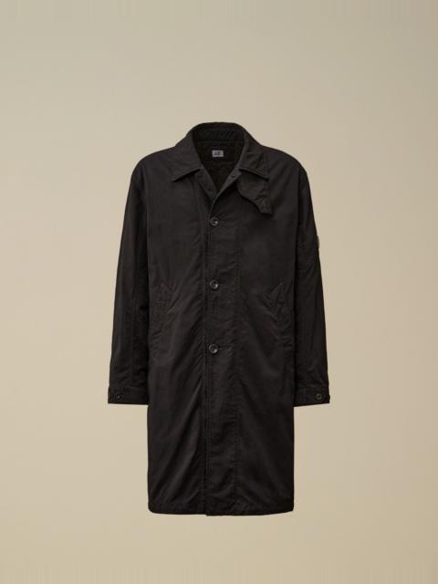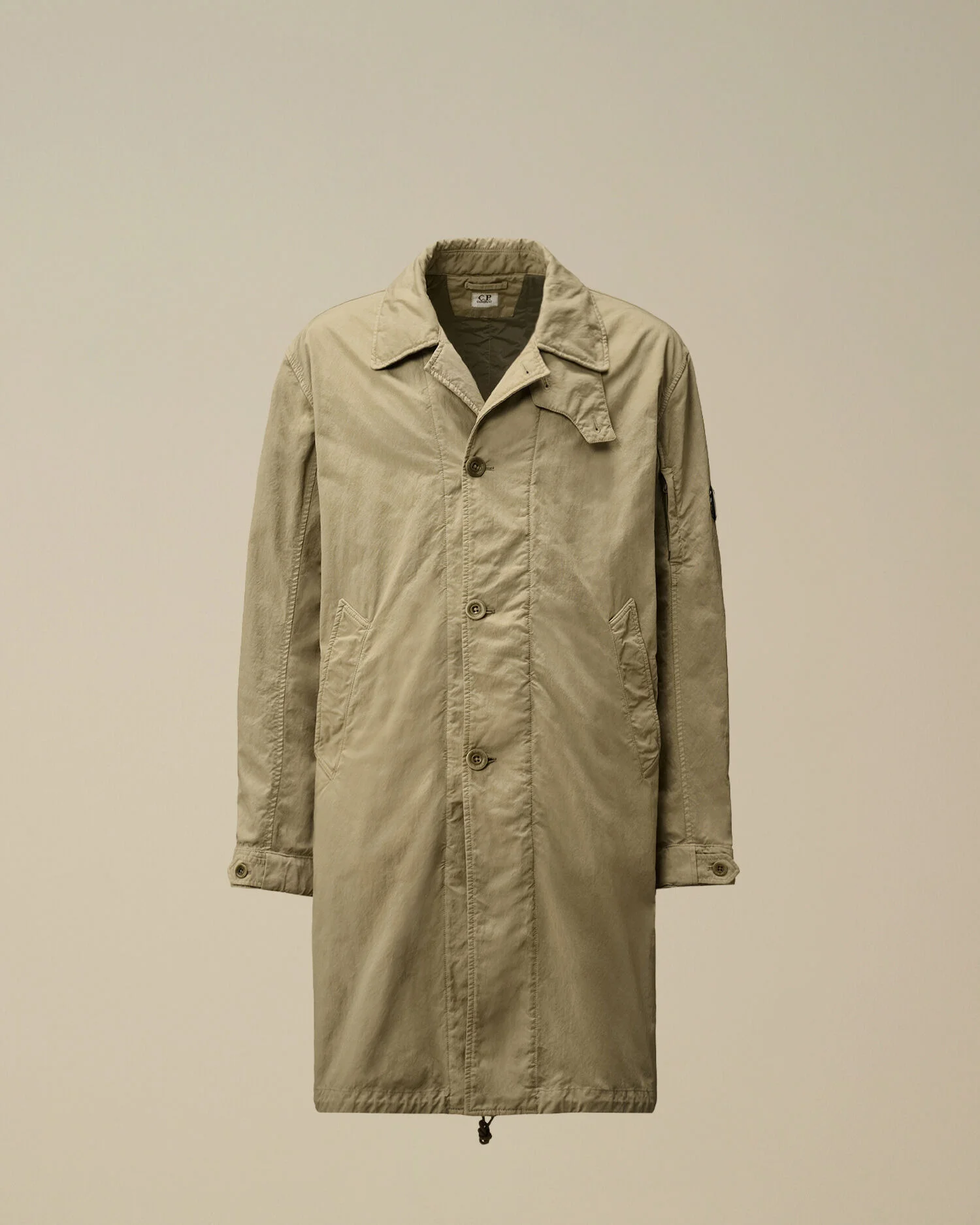 Fishtail padded coat crafted in heavy-duty left-hand twill, woven from two nylon taslan yarns. The coat features C.P. Company’s iconic Lens, a classic collar with a button placket, full button and snap fastening, and side pockets. Finished with a fishtail hem. Wadding padded and garment dyed. Regular fit. - Classic collar with button placket - Full button fastening with snap hem - Side pockets - Lens detail - Adjustable button cuffs - Fishtail hem - Garment dyed - Wadding padded - Regular fit CARE & COMPOSITION Care - Wash max 30°C - Mild process - Do not bleach - Do not tumble dry - Ironing maximum temperature 110°C - without steam - Do not dry clean - Line dry in the shade - Wash separately - Wash inside out - Do not soak - Remove detachable accessories before washing Composition - External fabric: 100% Polyamide / Nylon - Lining: 100% Polyamide / Nylon - Padding (Fiber): 100% Polyester - Secondary lining: 100% Polyamide / Nylon SIZE & FITTING - Fits true to size, take your normal size - Model is 186 cm-6' 1" / 98-103 cm chest and is wearing a size L PRODUCT PASSPORT PRODUCT - Weaving: Korea - Dyeing: Italy - Confection: Romania - Releases plastic microfibers into the environment during washing PACKAGING - Minimum percentage of recycled materials 70%