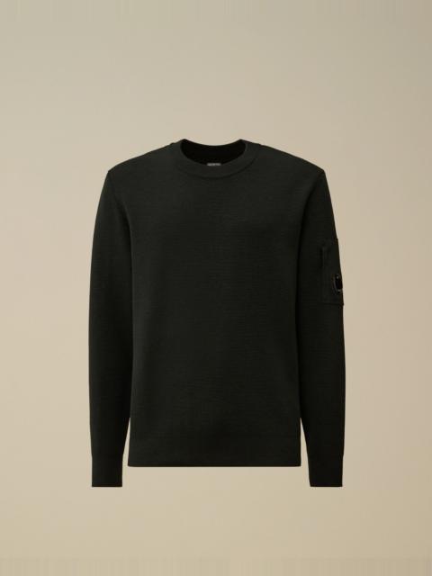 Crewneck sweater crafted in Re-Wool, an Extrafine Merino Wool blend certified by the Responsible Wool Standard (RWS) and combined with recycled Polyester certified by the Global Recycled Standard (GRS). The knit features C.P. Company’s iconic Lens, ribbed cuffs and hem. Gauge 12. Regular fit. - Ribbed crewneck - Lens detail - Ribbed cuffs and hem - 12 Gauge knit - Regular fit CARE & COMPOSITION Care - Wash max 30°C - Very mild process - Do not bleach - Do not tumble dry - Ironing maximum temperature 110°C - without steam - Dry cleaning in tetrachloroethene - mild process - Flat drip dry - Remove detachable accessories before washing Composition - External fabric: 55% Virgin wool, 45% Polyester SIZE & FITTING - Fits true to size, take your normal size - Model is 186 cm-6' 1" / 98-103 cm chest and is wearing a size L PRODUCT PASSPORT PRODUCT - Weaving: Bulgaria - Dyeing: China - Confection: Bulgaria - Product contains at least 40% of recycled material PACKAGING - Minimum percentage of recycled materials 70%