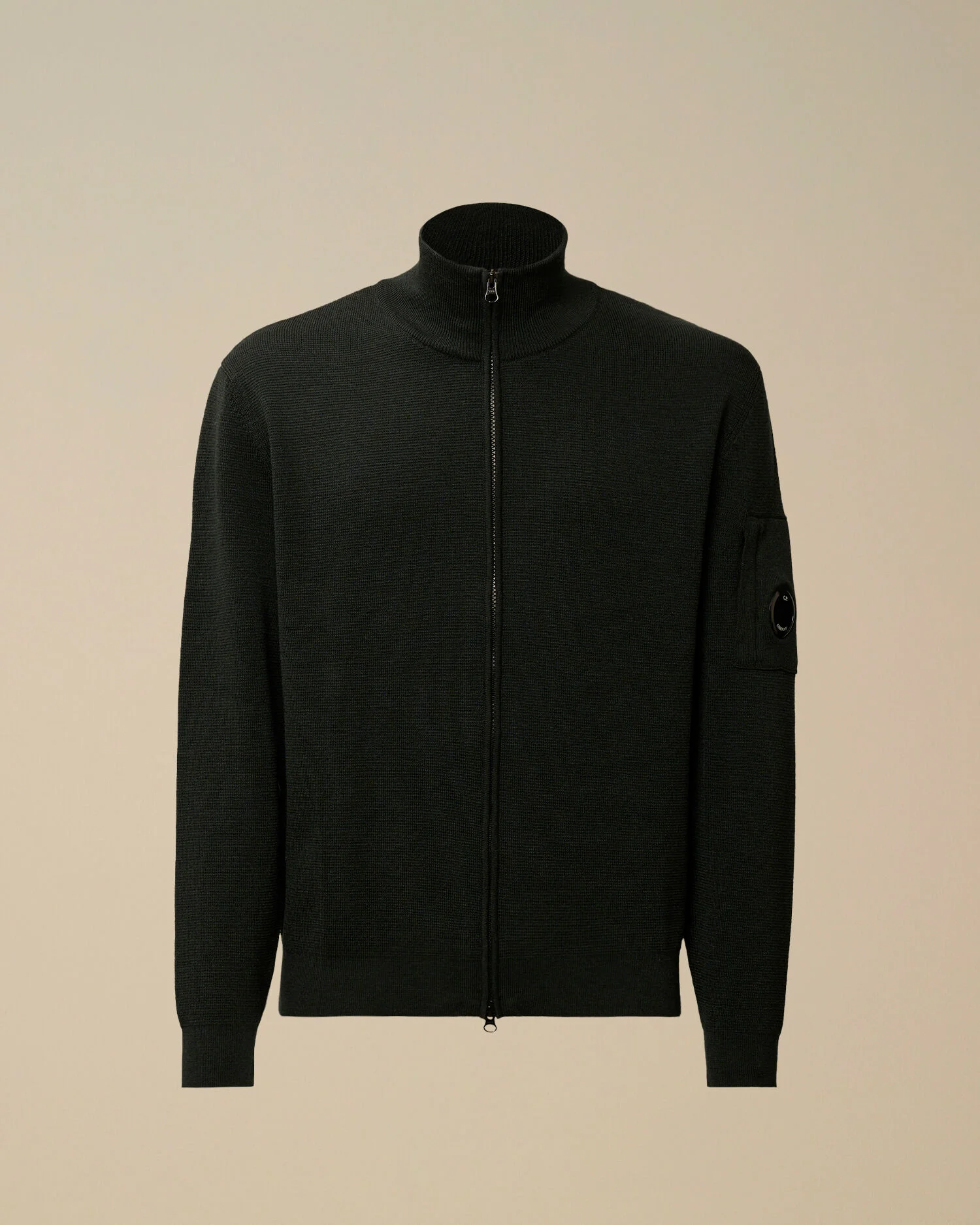 Full zip cardigan crafted in Re-Wool, an Extrafine Merino Wool blend certified by the Responsible Wool Standard (RWS) and combined with recycled Polyester certified by the Global Recycled Standard (GRS). The knit features a ribbed collar, and C.P. Company’s iconic Lens. Finished with ribbed cuffs and hem. Gauge 12. Regular fit. - Ribbed collar - Two-way full zip fastening - Lens detail - Ribbed cuffs and hem - 12 Gauge knit - Regular fit CARE & COMPOSITION Care - Wash max 30°C - Very mild process - Do not bleach - Do not tumble dry - Ironing maximum temperature 110°C - without steam - Dry cleaning in tetrachloroethene - mild process - Flat drip dry - Remove detachable accessories before washing Composition - External fabric: 55% Virgin wool, 45% Polyester SIZE & FITTING - Fits true to size, take your normal size - Model is 186 cm-6' 1" / 98-103 cm chest and is wearing a size L PRODUCT PASSPORT PRODUCT - Weaving: Bulgaria - Dyeing: China - Confection: Bulgaria - Product contains at least 40% of recycled material PACKAGING - Minimum percentage of recycled materials 70%