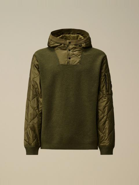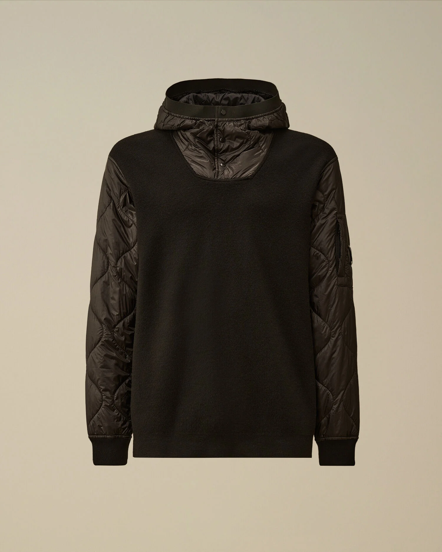 Half-button sweater crafted in Extrafine Merino Wool. The soft, lightweight yarn offers a refined texture and superior comfort. The adjustable buttoned hood and sleeves are crafted in D.D. Shell, quilted with Primaloft® Silver, an insulation solution with high thermal and breathability properties. The knit features C.P. Company’s iconic Lens and ribbed cuffs. Regular fit. - Adjustable buttoned hood in D.D. Shell quilted with Primaloft® Silver - Lens detail - Sleeves in D.D. Shell quilted with Primaloft® Silver - Ribbed cuffs - Regular fit CARE & COMPOSITION Care - Hand wash - Do not bleach - Do not tumble dry - Ironing maximum temperature 110°C - without steam - Dry cleaning in tetrachloroethene - mild process - Dry flat - Wash separately - Remove detachable accessories before washing Composition - External fabric: 100% Wool - Lining: 100% Polyamide / Nylon - Padding (Fiber): 100% Polyester - Secondary fabric: 100% Polyamide / Nylon SIZE & FITTING - Fits true to size, take your normal size - Model is 186 cm-6' 1" / 98-103 cm chest and is wearing a size L PRODUCT PASSPORT PRODUCT - Weaving: China - Dyeing: China - Confection: China PACKAGING - Minimum percentage of recycled materials 70%